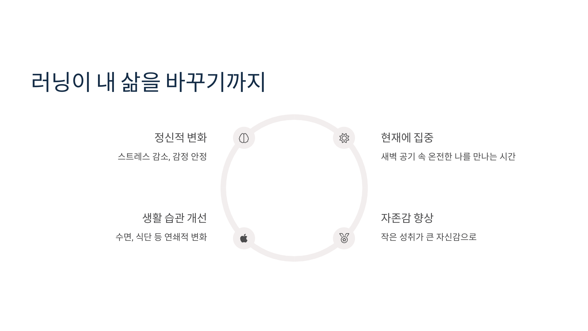 특히, 새벽 공기를 마시며 달리는 순간에는 ‘지금 이 순간을 온전히 살아가고 있다’는 느낌이 강하게 들었어요. 러닝은 단순한 운동이 아니라, 나를 만나는 시간이고, 나를 들여다보는 시간이었어요. 달리다 보면 생각이 정리되고, 쓸데없는 걱정들이 사라지더라고요. 하루하루 러닝을 마칠 때마다 스스로를 칭찬하게 되고, 그 작은 인정이 결국 자존감을 높여줬어요.