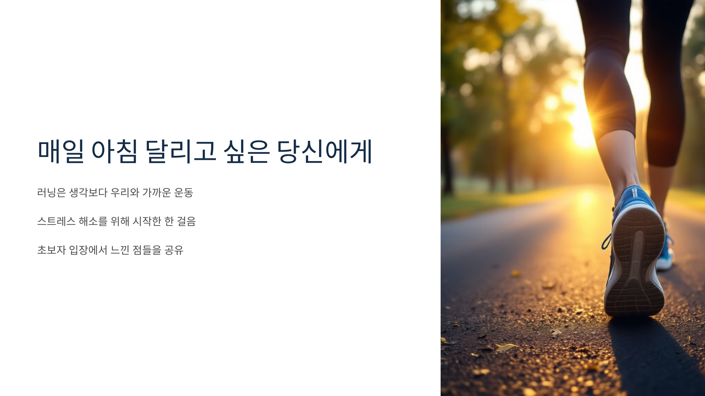러닝을 할 때 가장 중요한 건 나만의 속도를 찾는 거예요. 처음부터 무리해서 오래 뛰려고 하지 않아도 돼요. 조금씩, 아주 천천히 내 몸이 러닝이라는 활동에 익숙해지도록 만들어주는 게 핵심이거든요. 그리고 무엇보다, 그 과정에서 ‘내 몸의 목소리’를 잘 들어주는 게 중요하다는 것도 알게 되었죠.