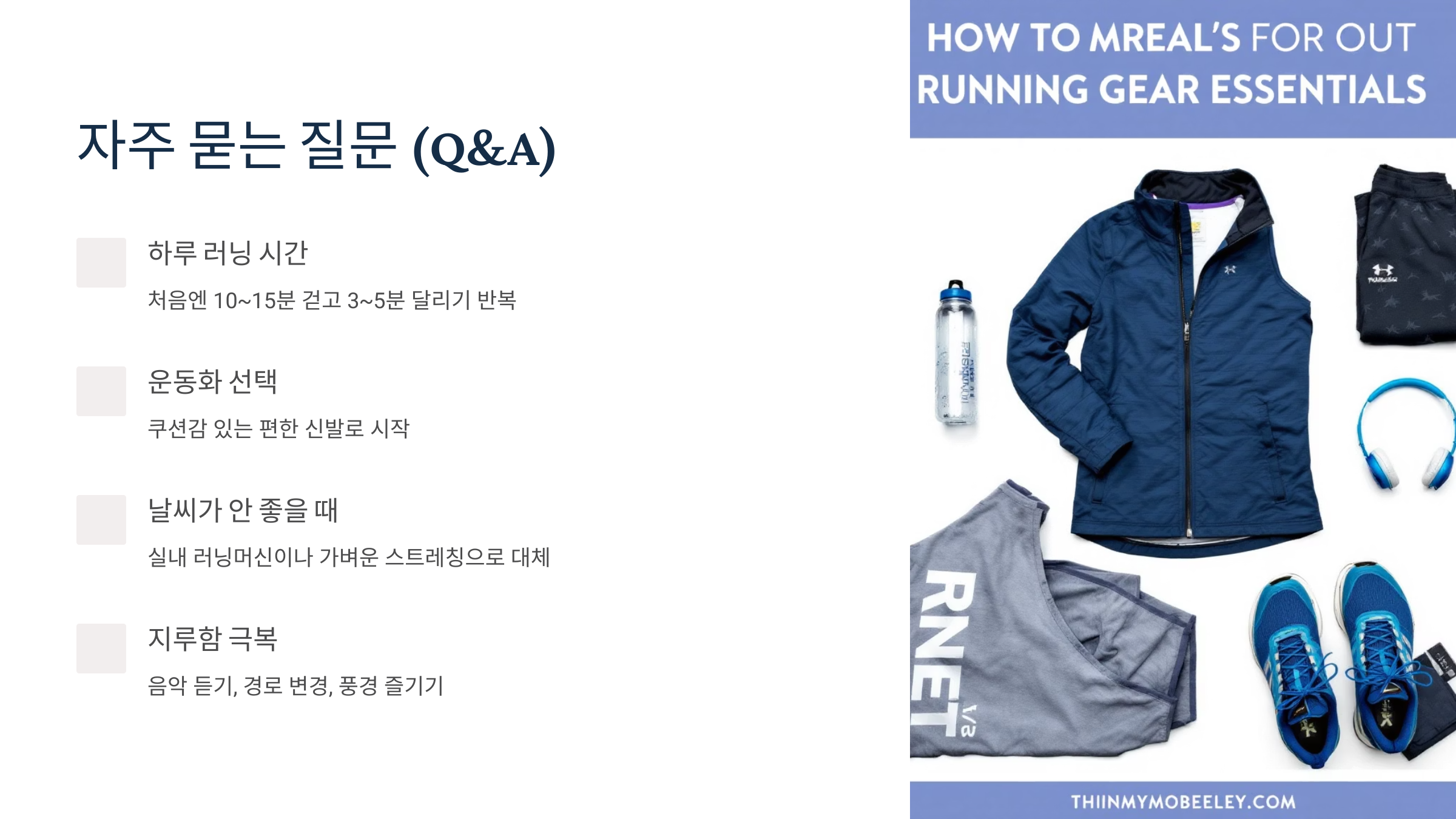 A1. 처음엔 10~15분 걷고 3~5분 달리기를 반복하며 몸을 적응시키는 것이 좋아요. 점점 익숙해지면 러닝 시간이 자연스럽게 늘어나요.