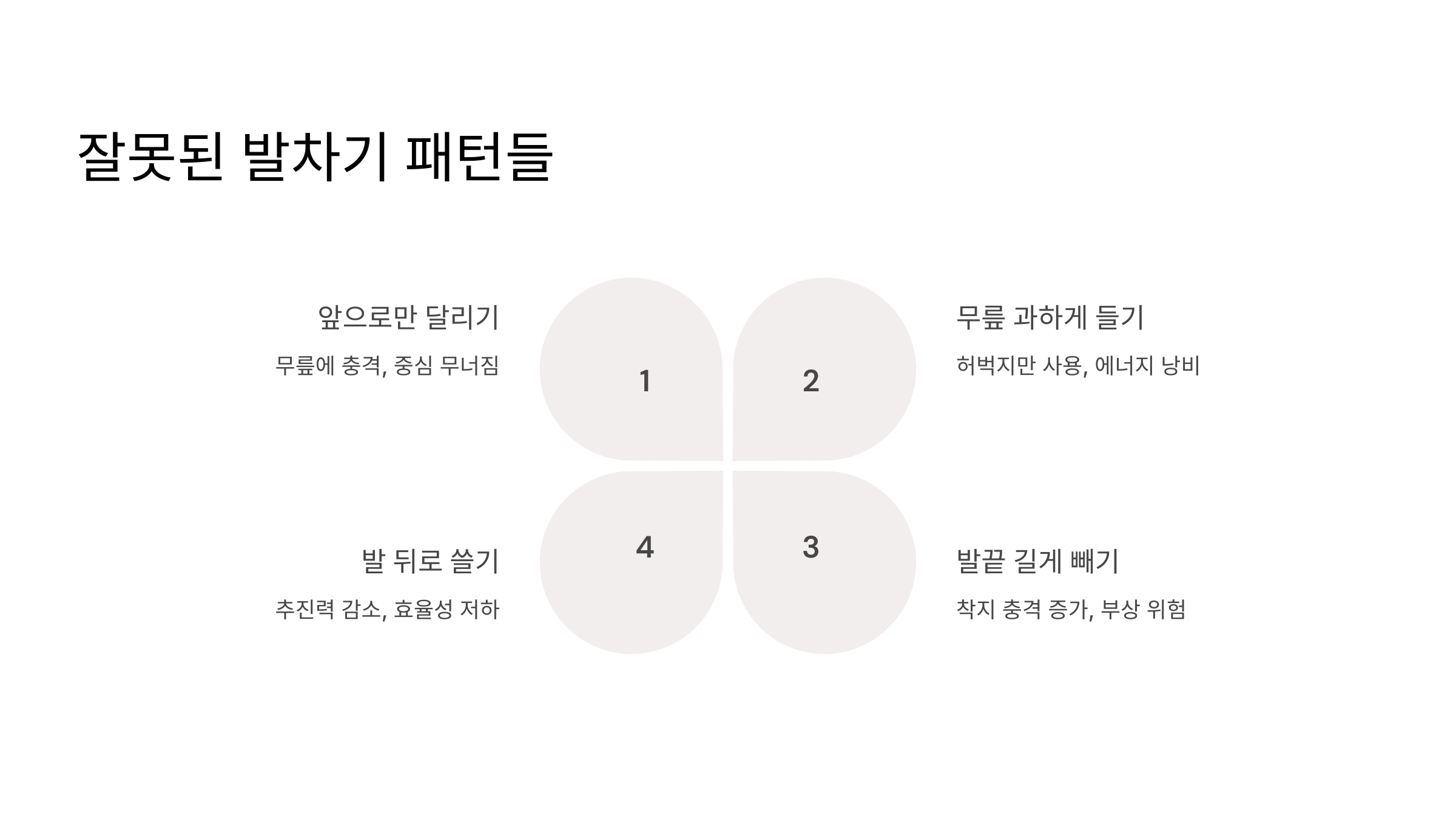 사실 러닝에서 '발차기'는 단순히 발을 앞으로 뻗는 동작이라고 생각하기 쉽지만, 그보다는 발을 어떻게 들어올리고, 언제, 어느 각도로 디딜지에 관한 전체적인 동작을 말해요. 예전엔 발을 그냥 땅에 내리치듯 뛰었어요. 그러다 보니 무릎에 무리가 오고, 오래 달리지 못했죠. 그런데 러너들의 자세를 보면 다리의 흐름이 매끄럽고 경쾌해요. 그 이유는 '발차기'가 잘 되어 있기 때문이더라고요.