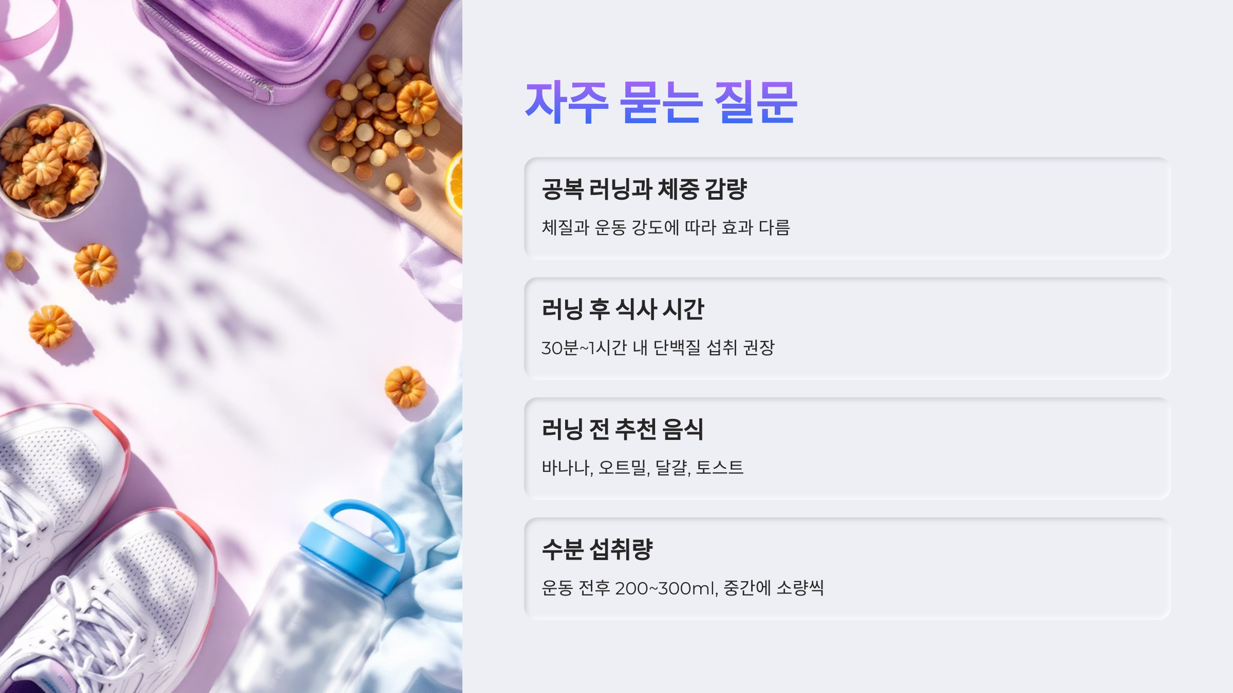그래서 제 결론은 이랬어요. 공복 러닝은 짧고 가볍게 운동하고 싶을 때만, 그리고 체력이 받쳐줄 때만. 그 외에는 간단하게라도 먹고 뛰는 게 훨씬 안정적이고 즐거웠어요. 결국 중요한 건 내 몸의 신호를 잘 듣는 거라는 걸 느꼈죠.