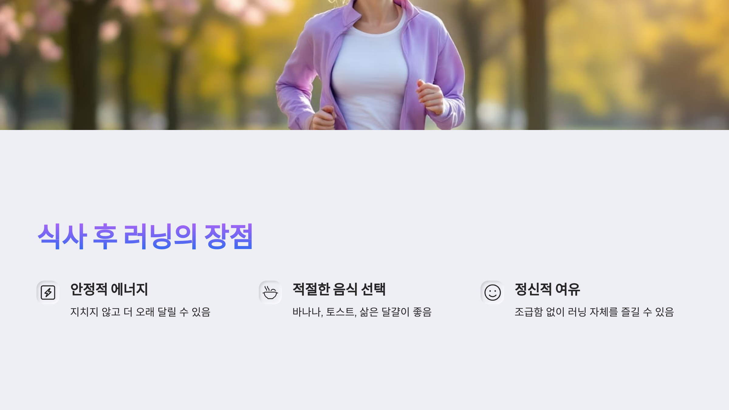 놀랍게도 체감 차이가 꽤 컸어요. 우선 에너지가 안정적으로 유지되니까 뛰는 동안 지치지 않았어요. 예전에는 3km만 뛰어도 힘들었는데, 식사를 어느 정도 하고 나니까 5km까지는 거뜬했죠. 물론 식사의 종류도 중요해요. 너무 기름지거나 무거운 음식을 먹고 뛰면 배가 더부룩하거나 속이 안 좋을 수 있어요. 저는 주로 바나나, 토스트 한 조각, 삶은 달걀 등 부담 없는 음식을 먹고 뛴 날이 가장 컨디션이 좋았어요.