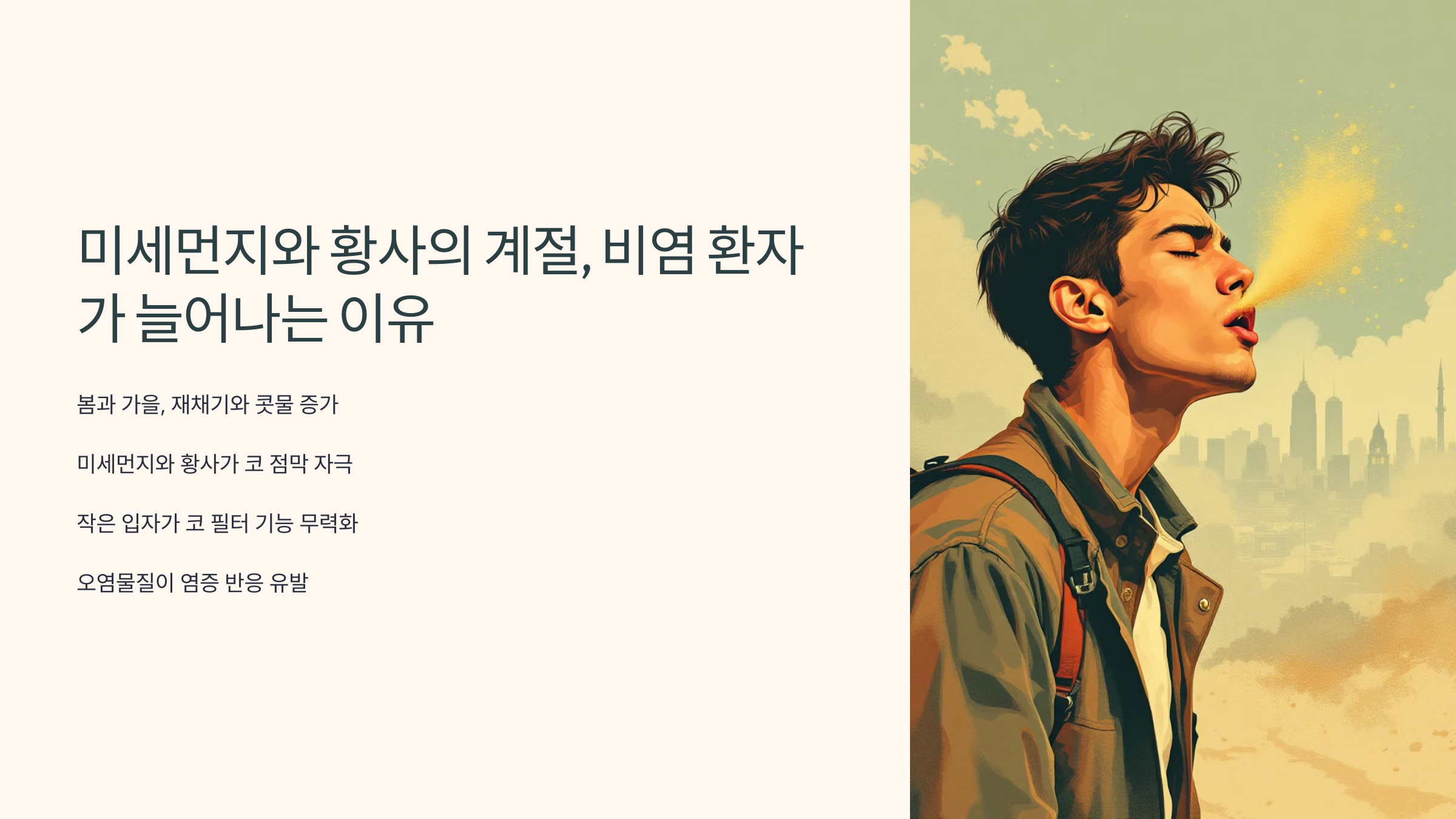 봄과 가을이 되면 많은 사람들이 재채기와 콧물, 코막힘을 호소합니다. 특히 미세먼지와 황사가 기승을 부리는 날에는 비염 환자들이 더욱 고통받습니다. 이는 단순한 감기가 아니라 공기 중 오염물질이 코 점막을 자극하면서 발생하는 알레르기성 비염 증상일 가능성이 큽니다. 미세먼지는 입자 크기가 작아 코의 필터 기능을 무력화시키고 점막에 직접 영향을 미칩니다. 황사 또한 단순한 흙먼지가 아니라 각종 오염물질과 함께 호흡기에 침투하여 염증 반응을 유발합니다. 그렇다면 이러한 환경 속에서 비염 환자는 왜 증가하는 것일까요? 그리고 우리는 어떻게 이를 예방할 수 있을까요?