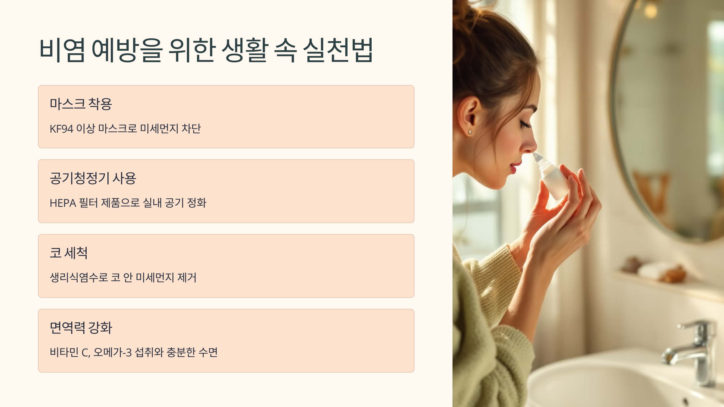 미세먼지와 황사가 심한 날에는 창문을 닫고 실내 공기질을 관리하는 것이 중요합니다. 실내 공기청정기를 사용하고, 실내에서 먼지가 쌓이지 않도록 청소를 자주 해야 합니다. 또한 흡연과 음주는 점막을 더욱 자극하여 비염 증상을 악화시킬 수 있으므로 가급적 피하는 것이 좋습니다. 특히 흡연은 비염뿐만 아니라 전반적인 호흡기 건강을 악화시키는 주된 요인 중 하나이므로 반드시 금연하는 것이 바람직합니다.