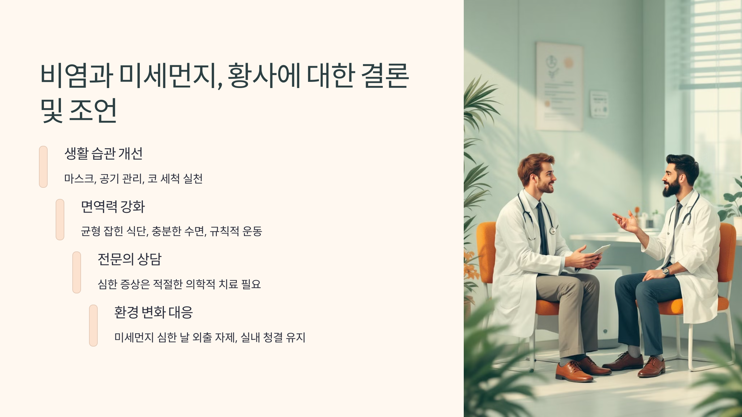 미세먼지와 황사는 단순히 환경적인 문제를 넘어 건강에 직접적인 영향을 미치는 요소입니다. 따라서 미세먼지가 심한 날에는 외출을 피하고, 부득이한 경우에는 철저한 대비가 필요합니다. 창문을 닫고 실내 공기 질을 관리하며, 청소를 철저히 하는 것만으로도 비염 증상을 완화하는 데 도움이 될 수 있습니다. 또한 스트레스 관리를 통해 면역 체계를 안정시키는 것도 중요합니다. 건강한 생활 습관을 유지하면서 환경 변화에 민감하게 반응한다면, 미세먼지와 황사로 인한 비염 증상을 최소화할 수 있을 것입니다.