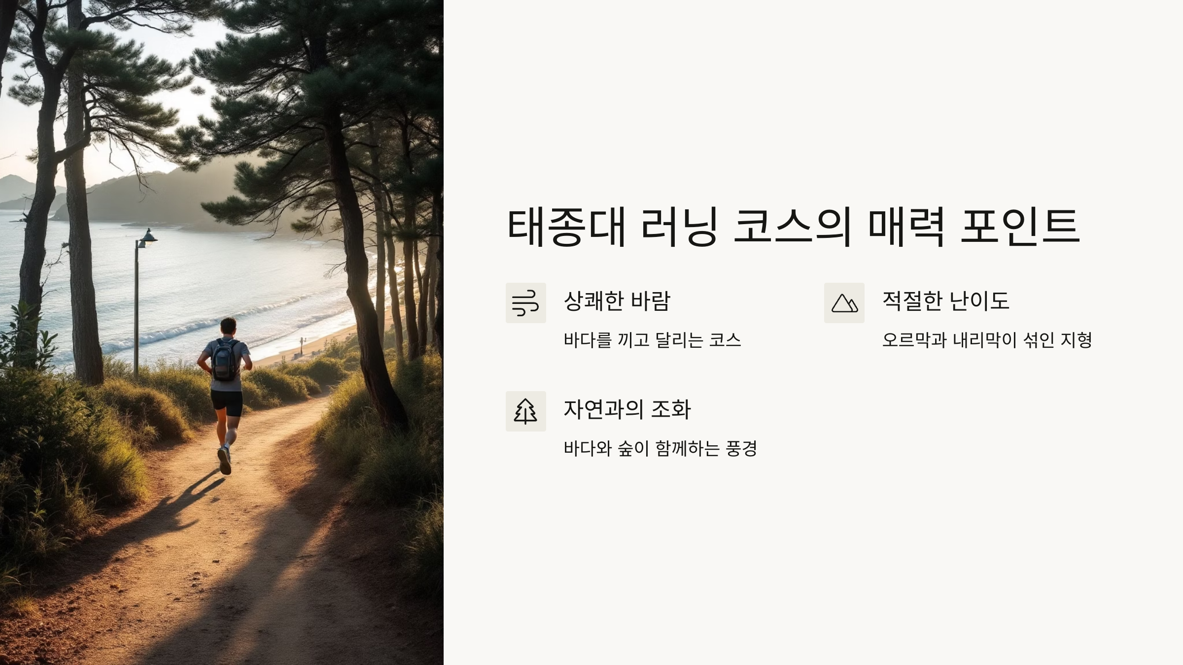 무엇보다 태종대 코스는 자연과 함께 달릴 수 있다는 점이 가장 큰 매력입니다. 왼쪽으로는 끝없이 펼쳐진 바다, 오른쪽으로는 푸르른 숲이 펼쳐져 있어요. 이 풍경 덕분에 달리는 내내 지루할 틈이 없어요. 마치 한 편의 영화 속 주인공이 된 듯한 기분으로, 발끝에 힘을 실으며 앞으로 나아가게 됩니다.