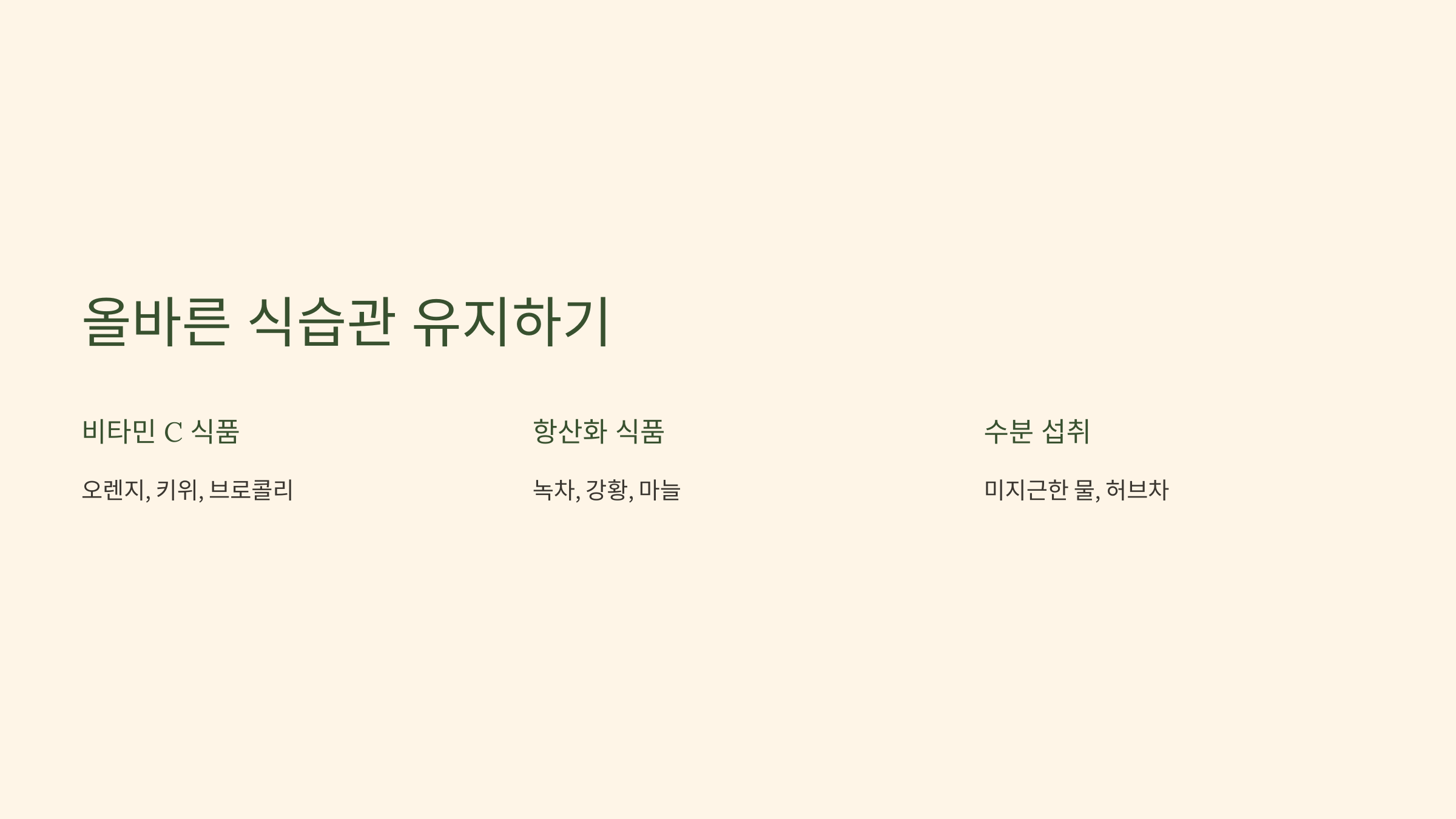 - 비타민 C가 풍부한 과일과 채소 (오렌지, 키위, 브로콜리 등)