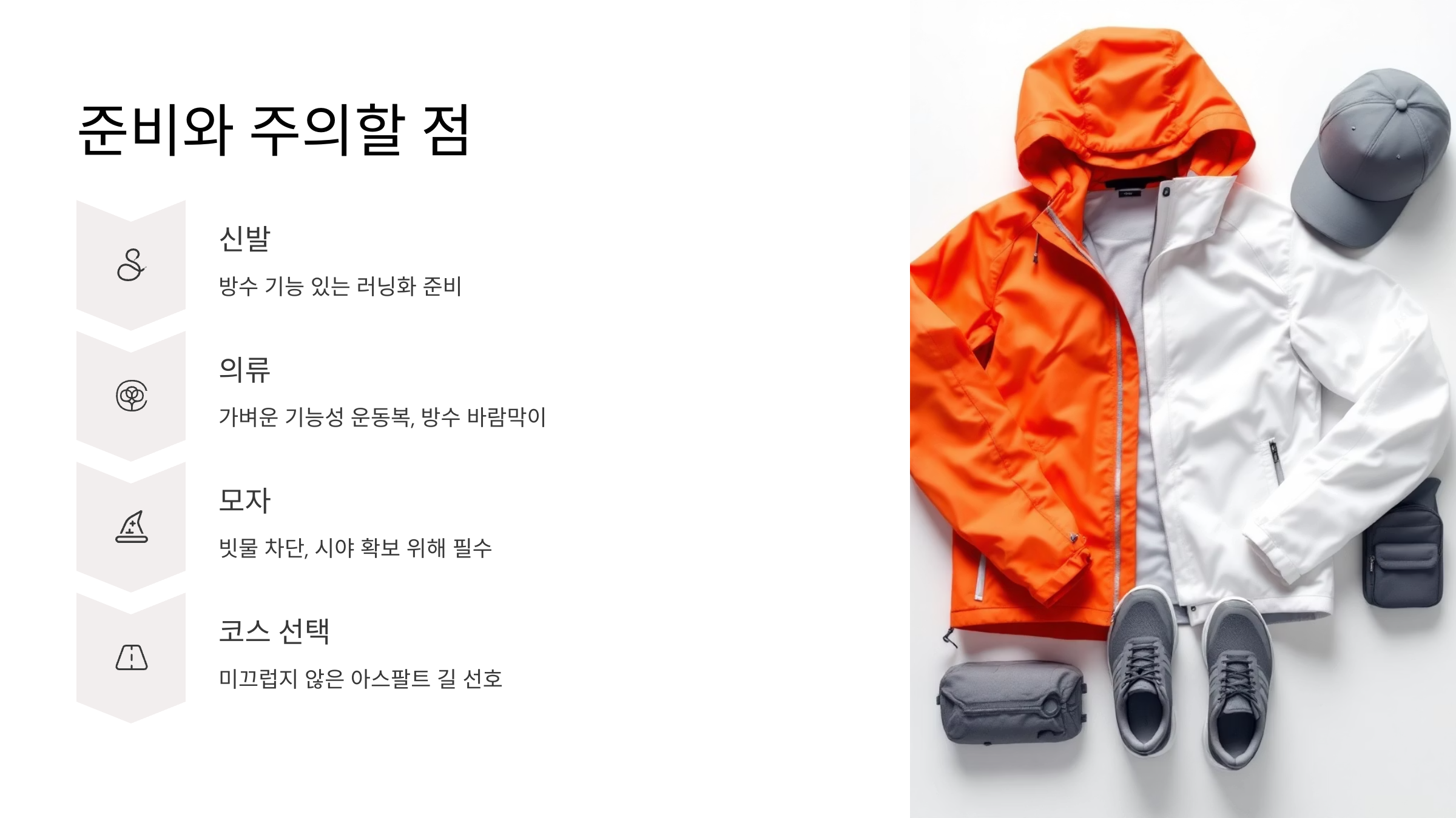 비 오는 날에도 러닝이 가능하다는 건 분명한 사실이지만, 그렇다고 아무 준비 없이 무작정 달려 나가선 안 돼요. 특히 미끄러운 노면, 젖은 옷과 신발 등은 부상의 위험으로 이어질 수 있기 때문에 조심해야 하죠. 저는 처음에 평소 신던 운동화를 신고 나갔다가 물에 젖은 채로 돌아왔던 기억이 있어요. 그 이후로는 방수 기능이 있는 러닝화를 따로 준비했답니다.