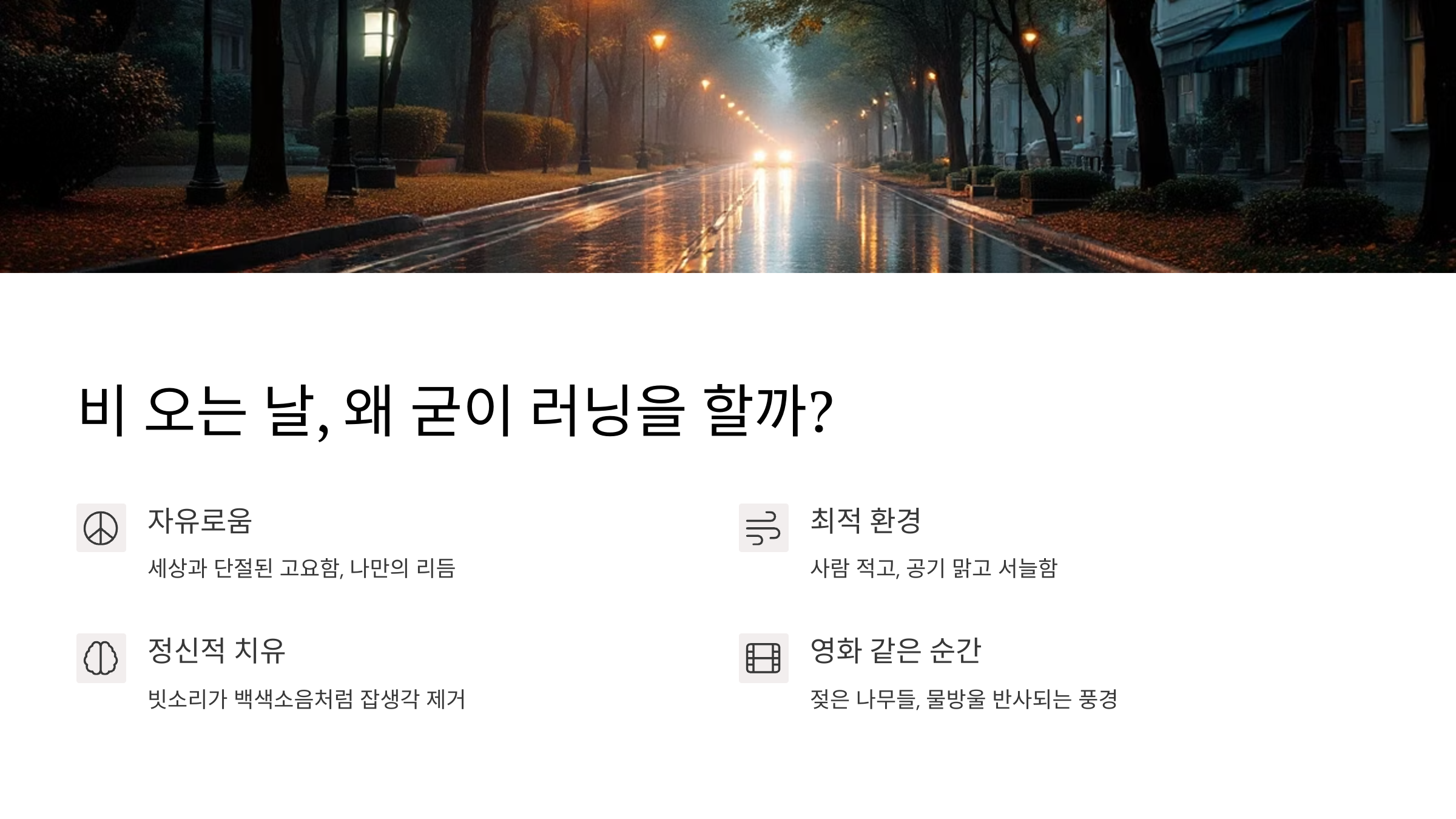 개인적으로는 비 오는 날 러닝을 통해 제 자신과 좀 더 가까워졌다고 느껴요. 혼자 있는 걸 두려워하던 저에게 혼자서도 충분히 좋은 시간을 보낼 수 있다는 걸 알려준 계기였고, 일상에 지쳤을 때 새롭게 숨 쉴 수 있는 통로가 되었어요. 날씨가 흐려서 기분까지 흐려지는 날, 그냥 포기하지 말고 운동화를 꺼내보세요. 그 안에서 의외로 크고 따뜻한 위로를 발견하게 될지도 몰라요.
