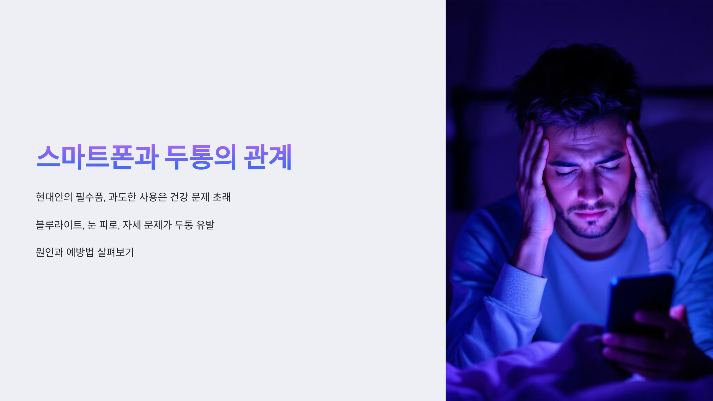 현대인들에게 스마트폰은 필수품이지만, 과도한 사용은 다양한 건강 문제를 초래할 수 있습니다. 특히 두통을 경험하는 사람들이 늘어나면서 스마트폰과의 관계에 대한 관심이 커지고 있습니다. 블루라이트 노출, 눈의 피로, 자세 문제 등이 두통의 주요 원인이 될 수 있습니다. 이번 글에서는 스마트폰 사용이 두통을 유발하는 이유를 상세히 살펴보고 예방 방법까지 알아보겠습니다.