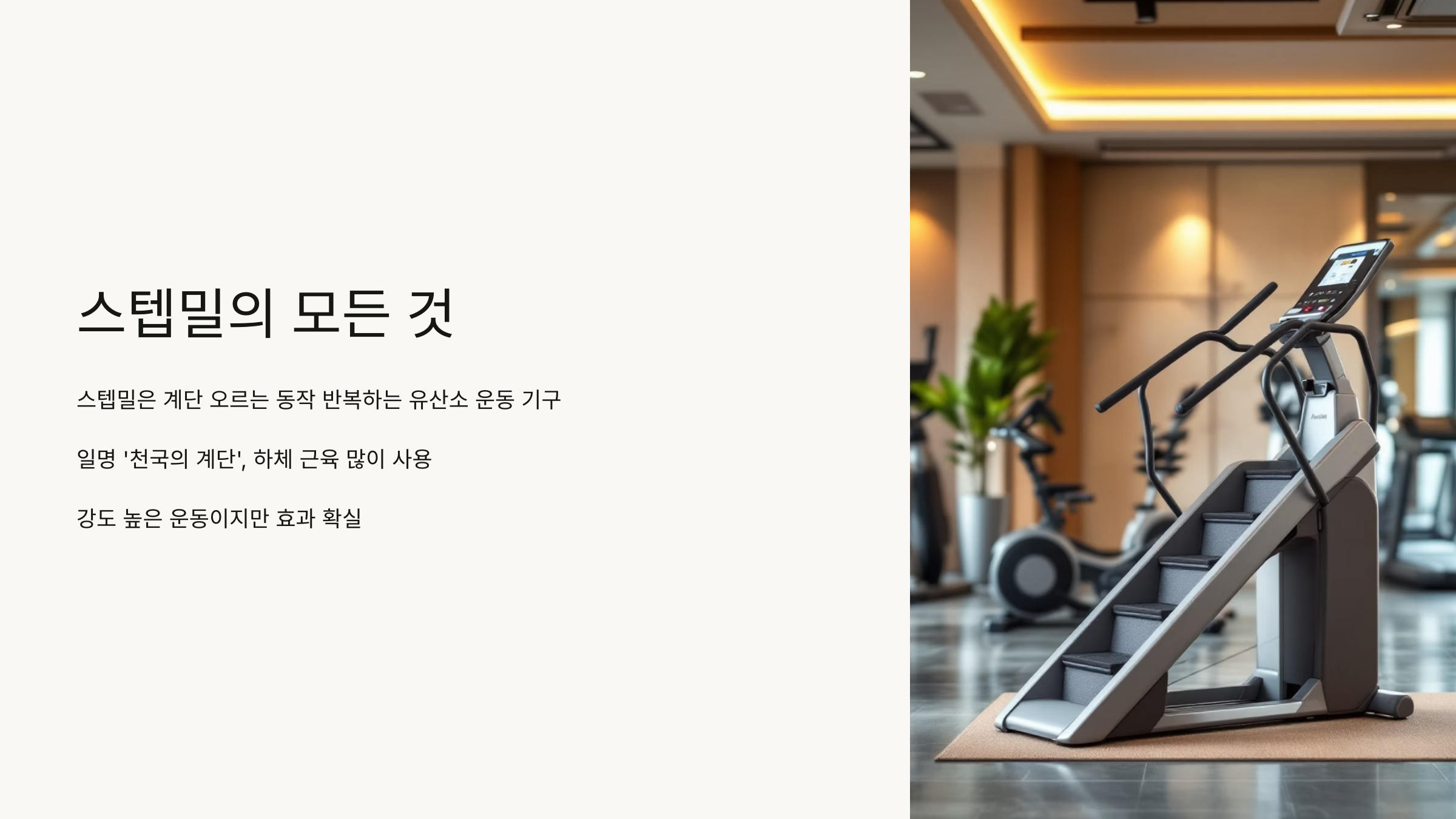 헬스장에서 자주 볼 수 있는 스텝밀, 일명 '천국의 계단'이라고도 불리는 이 기구는 계단을 오르는 동작을 반복하는 유산소 운동 기구입니다. 처음에는 단순해 보일 수 있지만, 막상 올라서서 몇 분만 움직여보면 금세 숨이 차오르고 땀이 흐르기 시작합니다. 저도 처음 스텝밀을 접했을 때, "이게 뭐 이렇게 힘들지?"라는 생각이 들 정도로 강도 높은 운동이었습니다. 하지만 그만큼 효과도 확실하다는 것을 느꼈습니다.