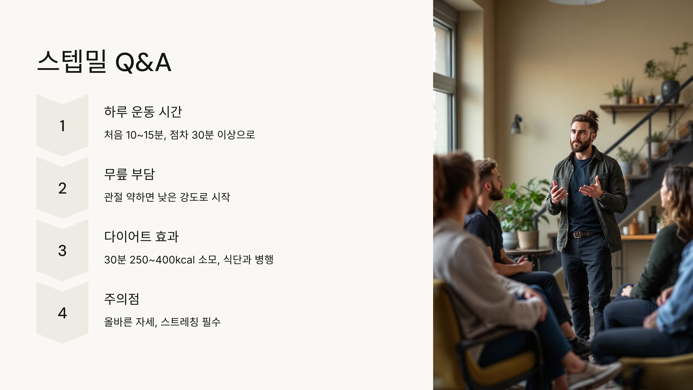 A: 하체 근력 강화, 심폐 지구력 향상, 체중 감량 등을 목표로 하는 분들에게 추천합니다. 단, 관절이 약한 분들은 주의가 필요합니다.