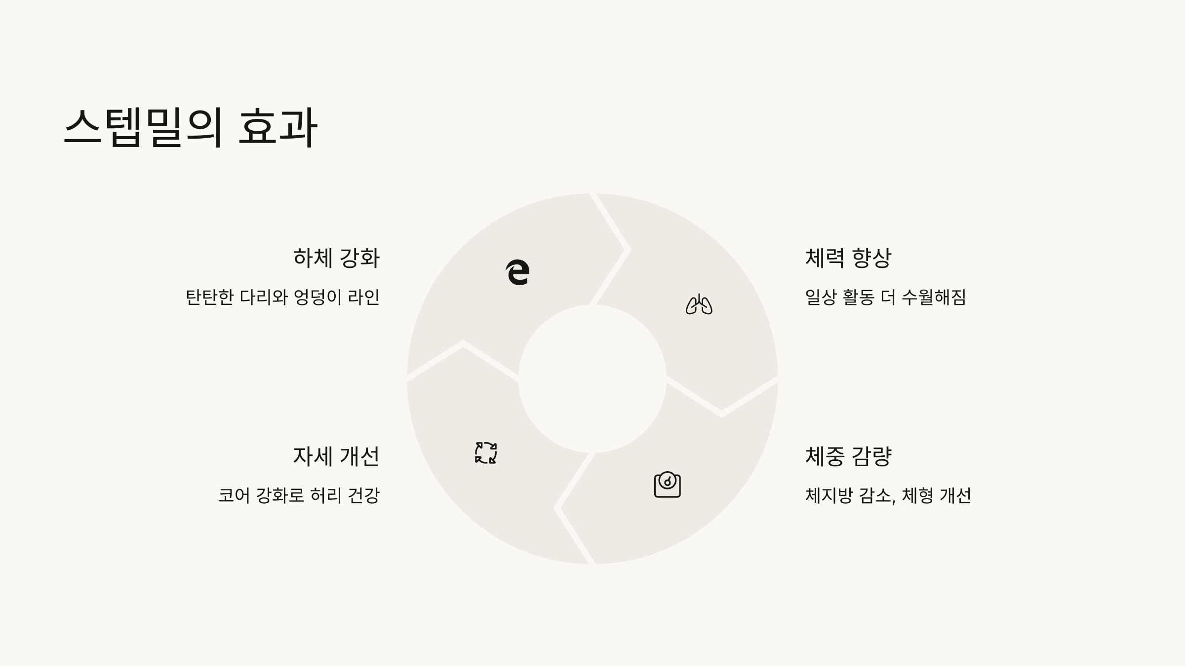 스텝밀을 할 때 등을 곧게 펴고 중심을 잡으려고 노력하면서, 자연스럽게 복부에 힘이 들어가고 허리 주변도 단단해지는 느낌을 받았습니다. 특히 앉은 자세가 많은 직장인이나 학생들에게는 허리 건강을 위해서도 좋은 운동이에요.