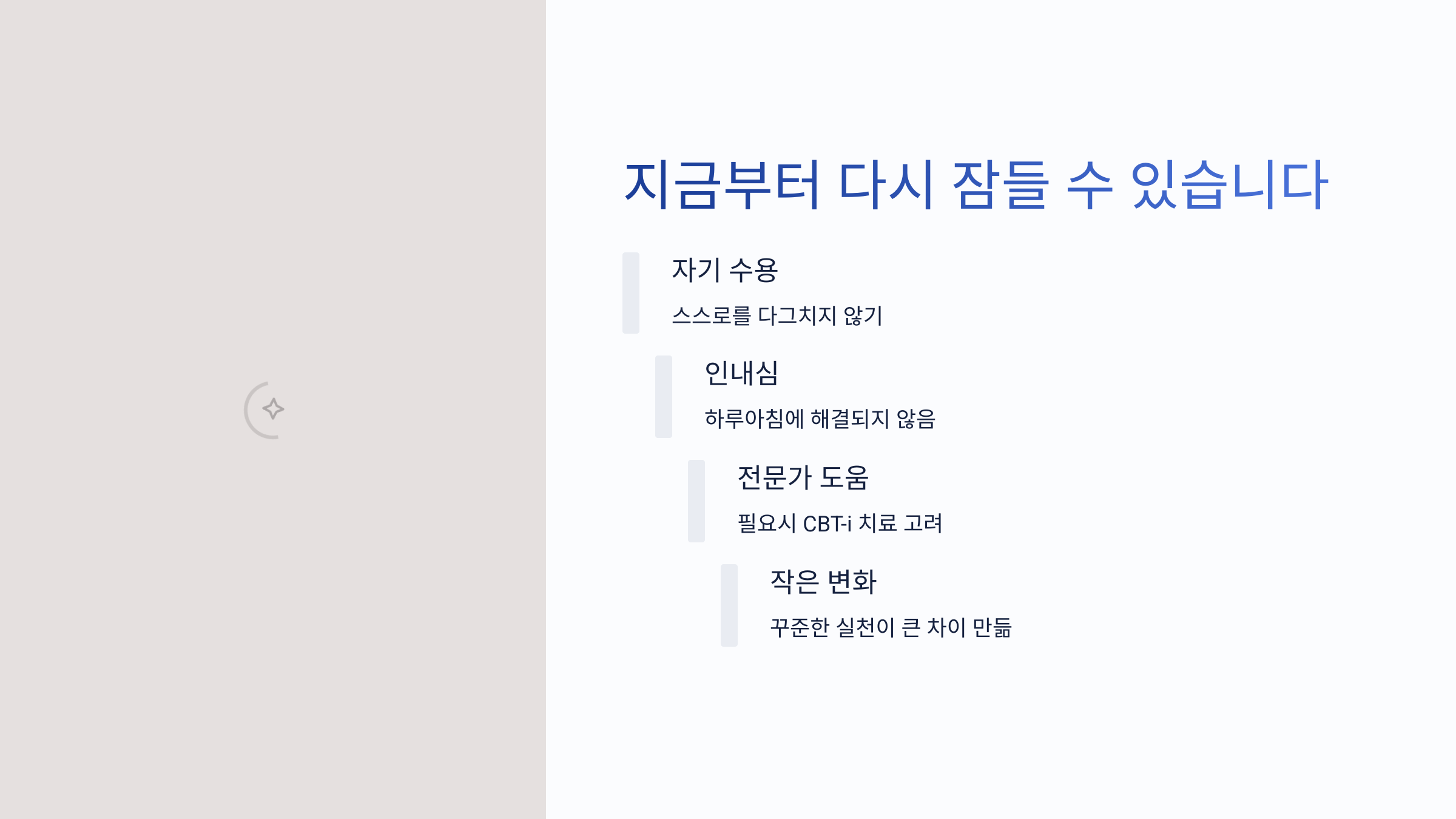 또한 수면을 위한 실천은 하루아침에 결과가 나오지 않을 수 있습니다. 그렇기 때문에 인내심이 필요합니다. 오늘은 조금 덜 자더라도 내일은 더 잘 잘 수 있다는 희망을 가지는 것이 중요합니다. 때로는 전문가의 도움을 받는 것도 좋은 방법입니다. 인지행동치료(CBT-i)는 과학적으로 입증된 불면증 치료법으로, 수면을 방해하는 부정적인 생각과 행동을 교정해줍니다. 병원에서 쉽게 상담받을 수 있으니 혼자 너무 오래 고민하지 마세요.