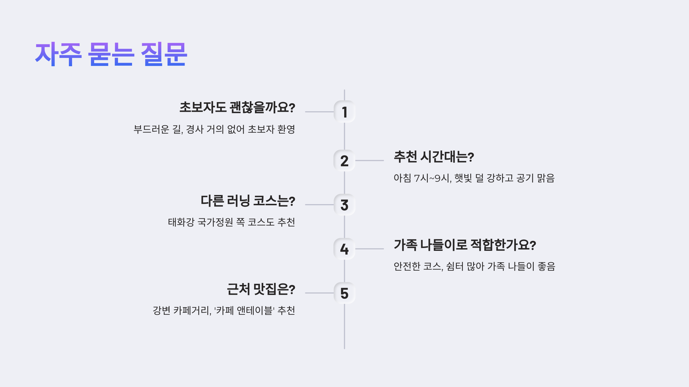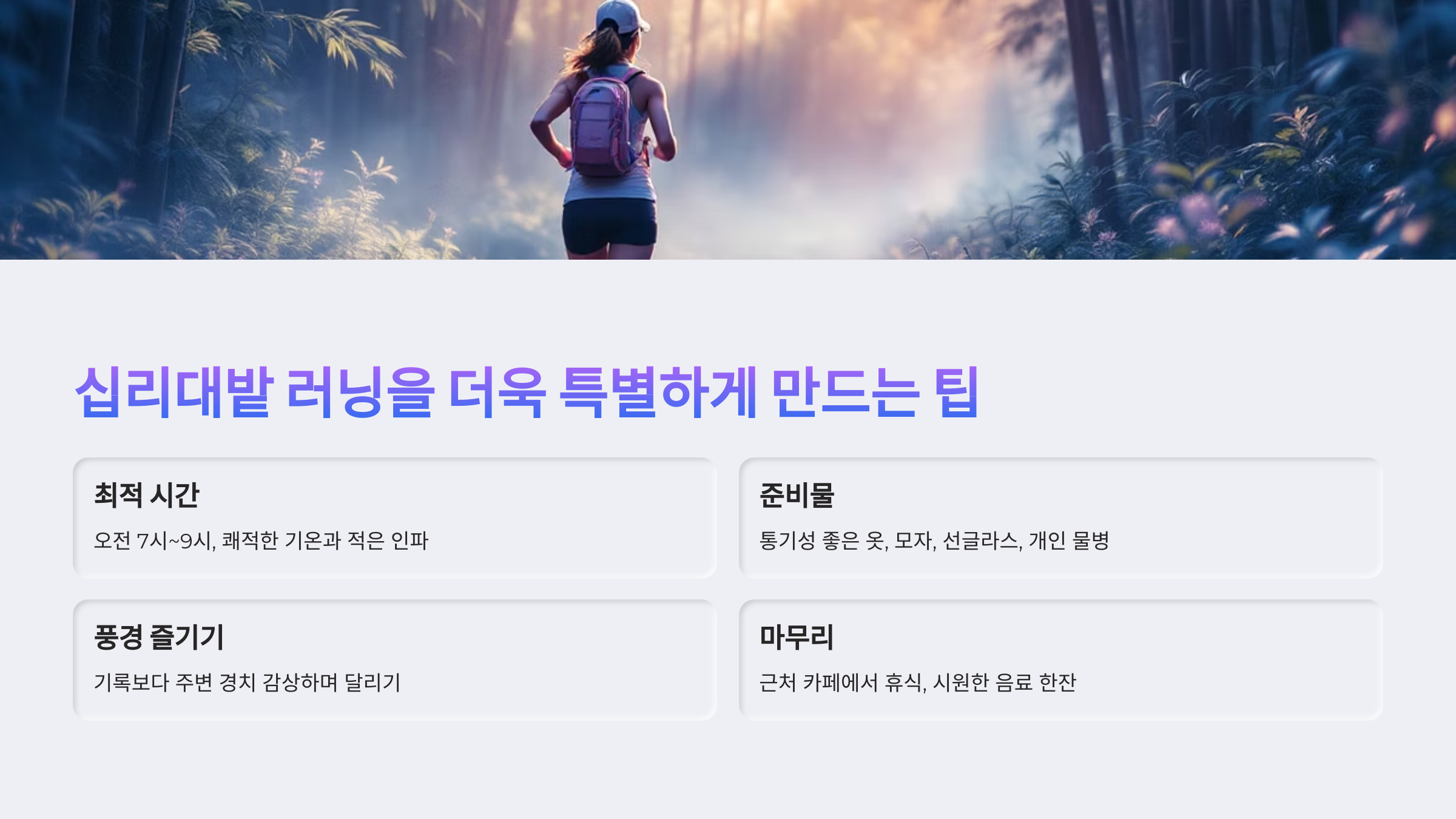또 하나! 달리는 동안 주변 풍경을 꼭 느껴보세요. 저는 처음에 기록에만 집중해서 달리다가, 중간에 잠깐 멈춰 서서 강변을 바라봤는데요, 그 순간 마음이 탁 트이면서 러닝이 훨씬 즐거워졌어요. 경치를 즐기면서 달리는 것, 그것이 십리대밭 러닝의 진정한 매력이라고 생각합니다.