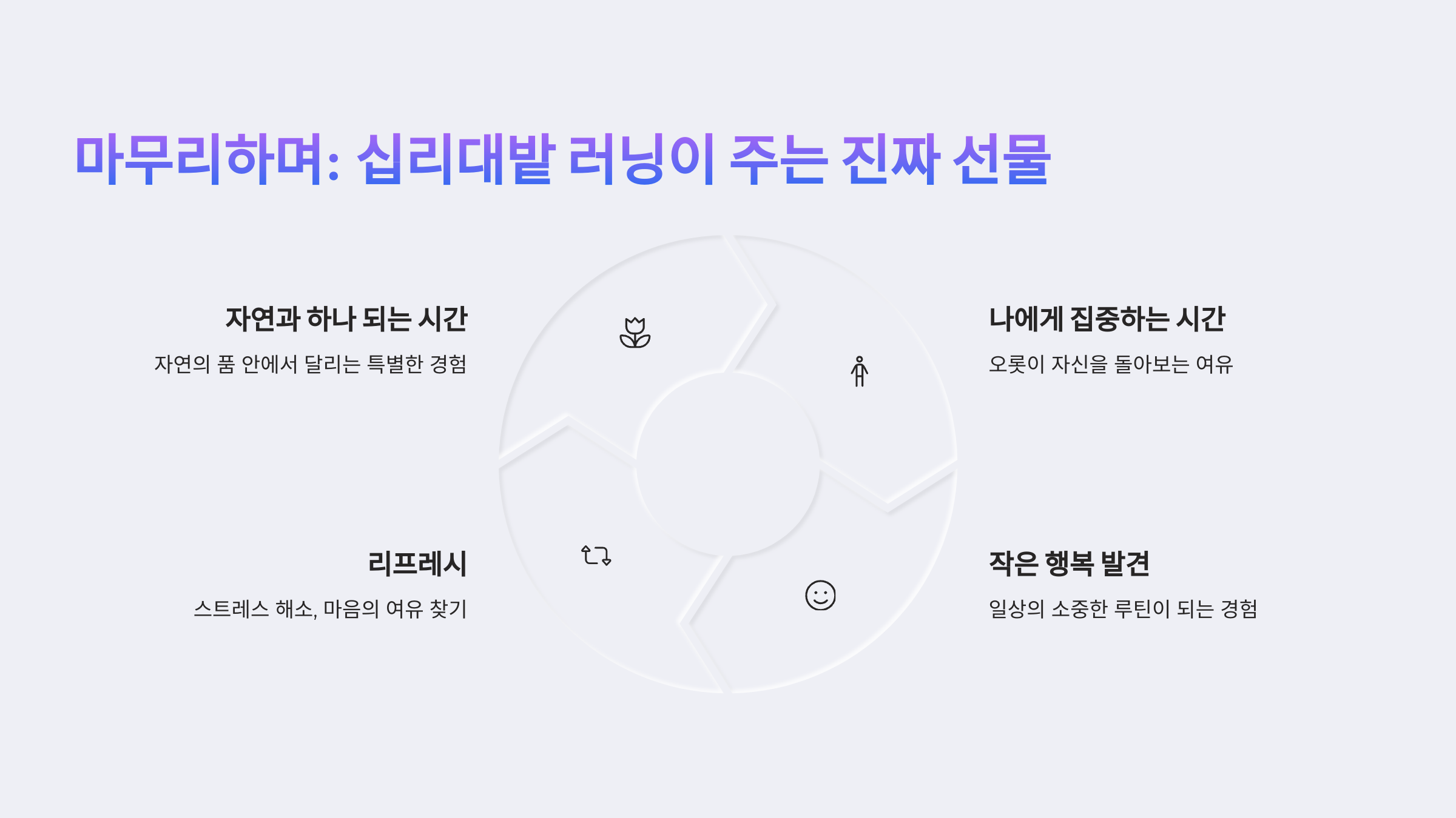 마지막으로, 무엇보다도 십리대밭 러닝은 '자연 속에서 나를 찾는 시간'이었어요. 빠르게 지나가는 일상 속에서 이렇게 한 템포 쉬어가며 자신을 들여다보는 시간이 얼마나 소중한지 새삼 깨달았습니다. 달리기 그 자체뿐 아니라, 내 마음을 다독이는 데에도 큰 도움이 되었어요.