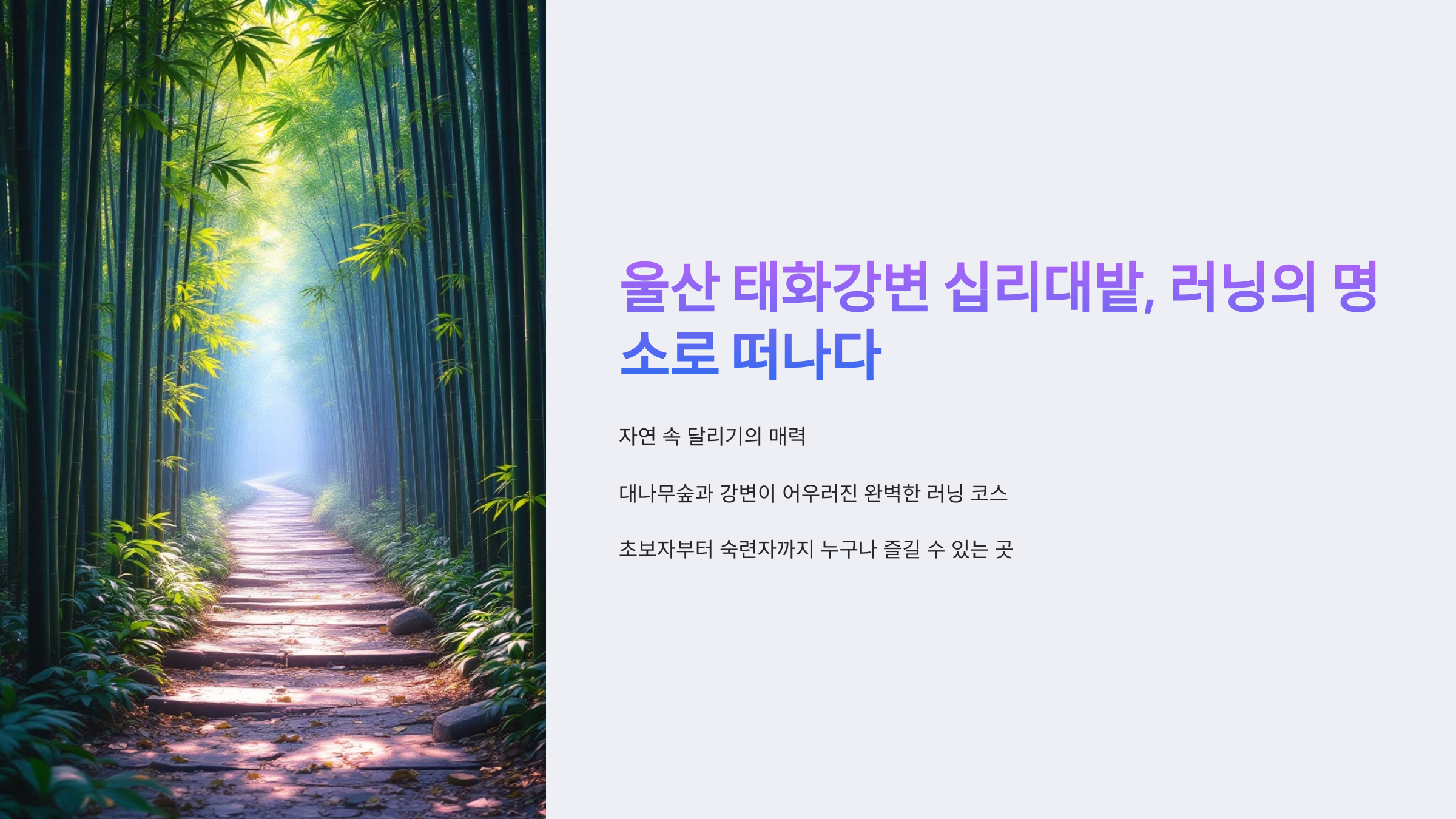 여러분, 러닝 좋아하시나요? 저는 달리기를 그리 잘하는 편은 아니지만, 자연을 벗 삼아 천천히 달리는 걸 정말 좋아하는 편입니다. 그래서 이번에 소개할 곳은 바로 울산 태화강변 십리대밭입니다. 사실 처음엔 '여기서 뛰는 게 그렇게 좋을까?' 하고 반신반의했는데요, 직접 가보니 그 매력에 푹 빠져버렸습니다. 그래서 오늘은 제가 경험한 십리대밭 러닝 코스를 아주 친절하게, 그리고 생생하게 안내해드리려고 해요. 아직 십리대밭을 가보지 않은 분들이라면, 이 글을 읽고 꼭 한 번 발걸음 해보셨으면 좋겠어요.