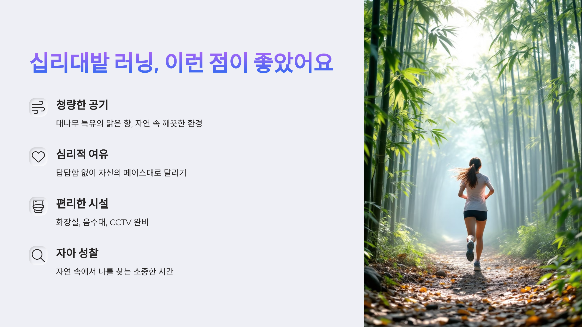 요즘 스트레스로 지쳐 있다면, 머릿속이 복잡해서 리프레시가 필요하다면, 그리고 조용히 나를 돌아보는 시간이 필요하다면 꼭 한 번 십리대밭을 찾아보세요. 달리는 발걸음 하나하나에 마음이 가벼워지고, 어느새 미소 짓고 있는 자신을 발견할 수 있을 거예요.