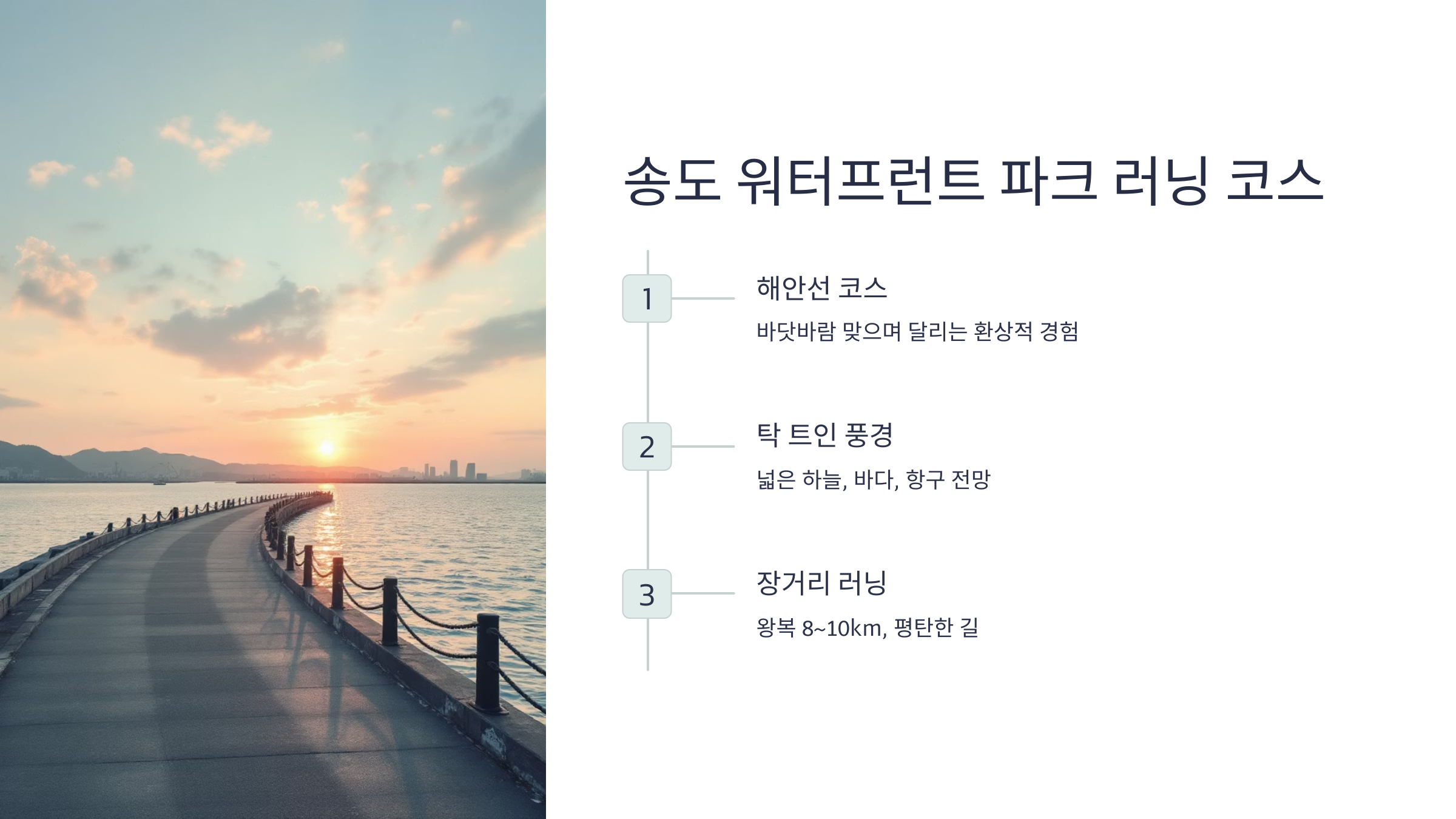 이 코스는 약간 긴 편인데요, 왕복하면 8~10km 정도 돼요. 처음부터 끝까지 평탄한 길이 이어지기 때문에 장거리 러닝을 연습하고 싶은 분들에게 특히 추천드려요. 저는 주로 해 질 무렵에 이 코스를 달리는데, 붉게 물든 하늘과 바다를 보며 뛰는 기분은 정말 황홀해요. 중간중간 전망대처럼 꾸며진 포인트가 있어서 잠깐 멈춰 쉬거나, 바다 사진을 찍기도 좋답니다.