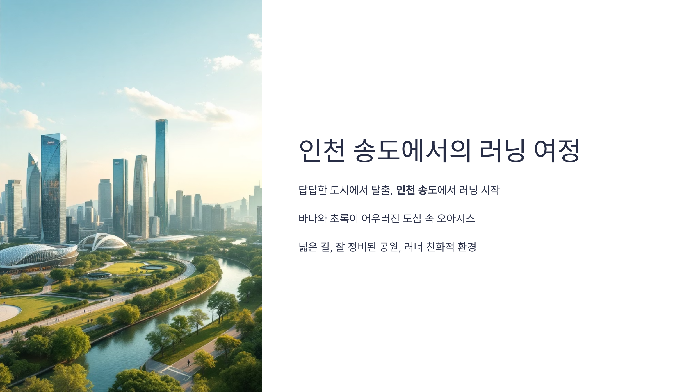 여러분, 달리기를 좋아하시나요? 저는 어느 날, 답답한 도시 한복판을 달리다가 문득 깨달았어요. "좀 더 탁 트인 곳에서 달리고 싶다!"는 마음이요. 그렇게 찾게 된 곳이 바로 인천 송도였답니다. 송도는 바다와 초록이 어우러진 도심 속 오아시스 같은 느낌을 주는 곳이에요. 특히 넓은 길과 잘 정비된 공원이 많아서 러닝하기 정말 좋은 환경이 갖춰져 있어요.