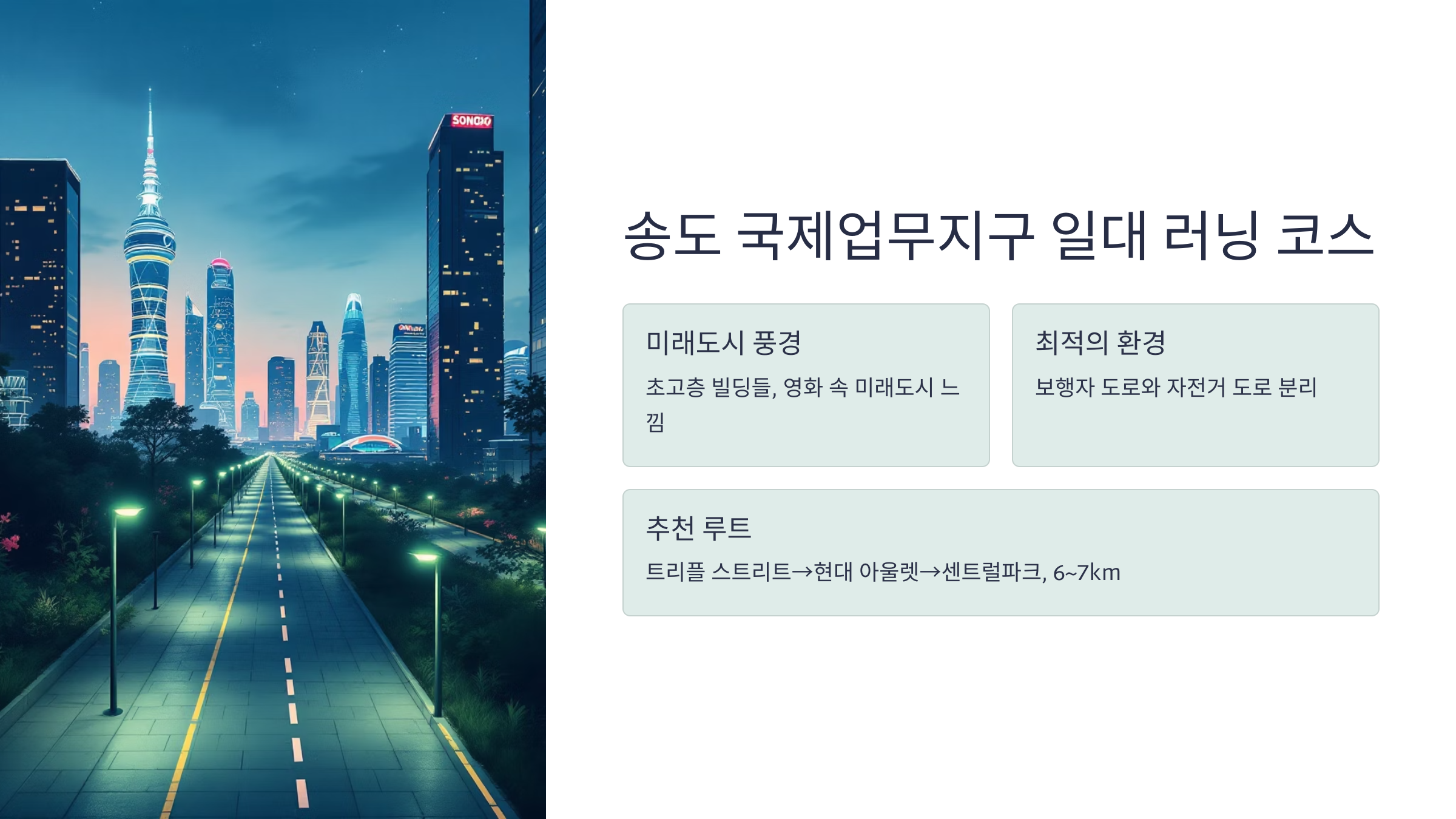 조금 색다른 느낌을 원하신다면 송도 국제업무지구 일대를 달려보세요. 이곳은 초고층 빌딩들과 미래적인 도시 풍경이 펼쳐진 곳이라, 마치 영화 속 미래 도시를 달리는 기분이 들거든요.