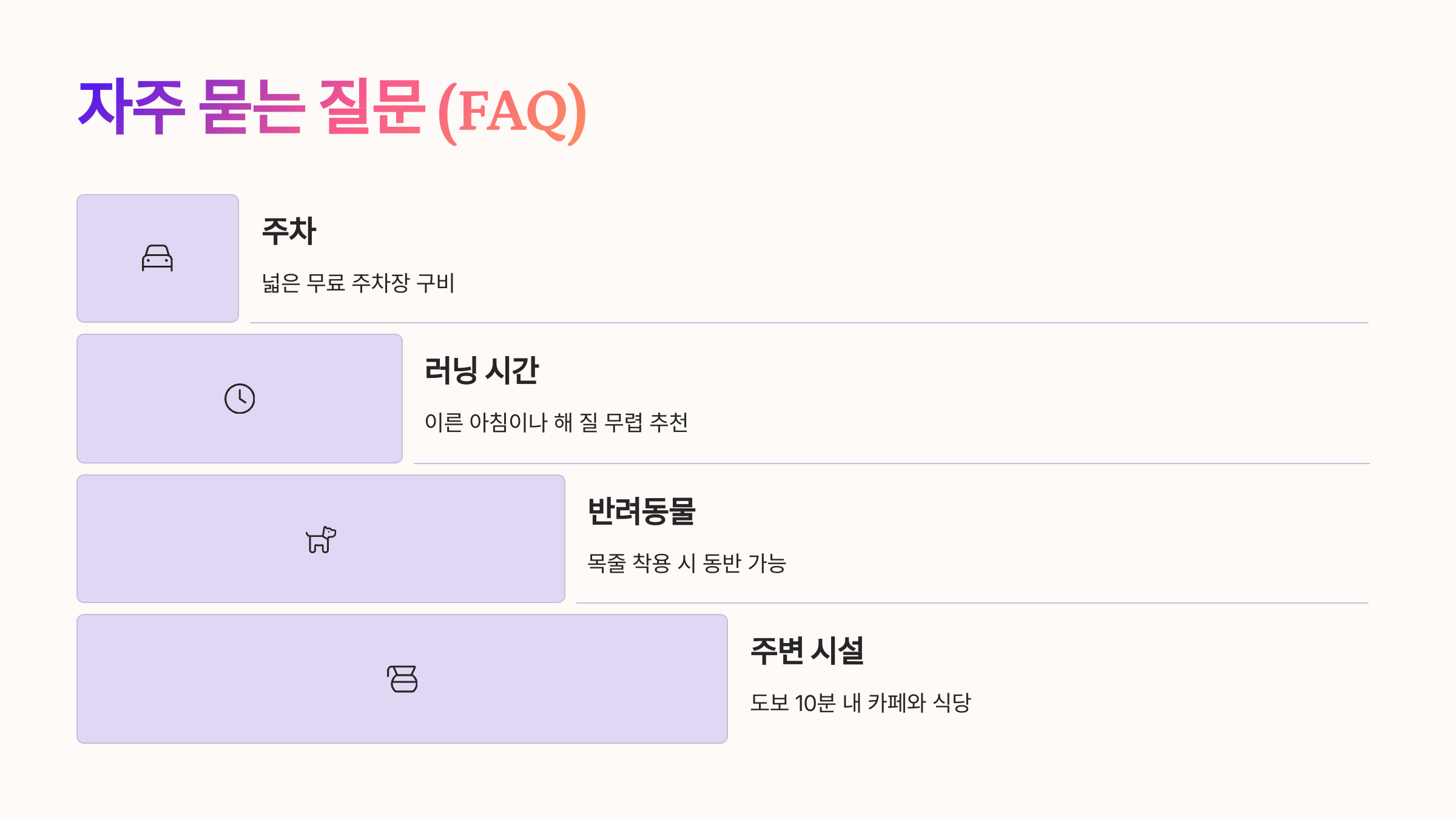 A4. 도보로 10분 이내 거리에 카페와 식당이 있어 러닝 후 가볍게 식사나 커피 한 잔 즐기기 좋아요. 특히 브런치 카페가 꽤 인기 있답니다.