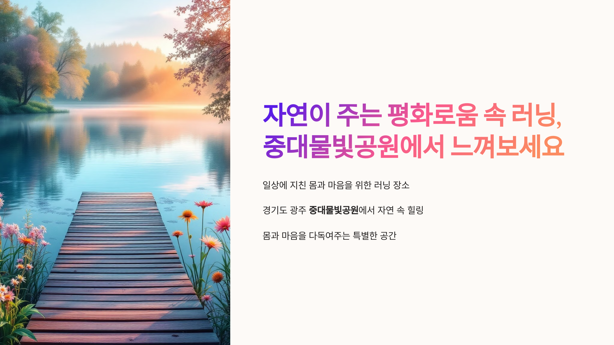 일상에 지치고 머릿속이 복잡할 때, 저는 종종 가볍게 러닝화를 꺼내 신습니다. 머리보다 몸이 먼저 움직이도록 하는 그 습관 덕분에 여러 곳을 다녀봤는데요, 최근 정말 인상 깊었던 곳이 바로 경기도 광주에 위치한 중대물빛공원이었어요. 이름부터 왠지 마음을 편안하게 해주는 느낌이 들지 않나요?