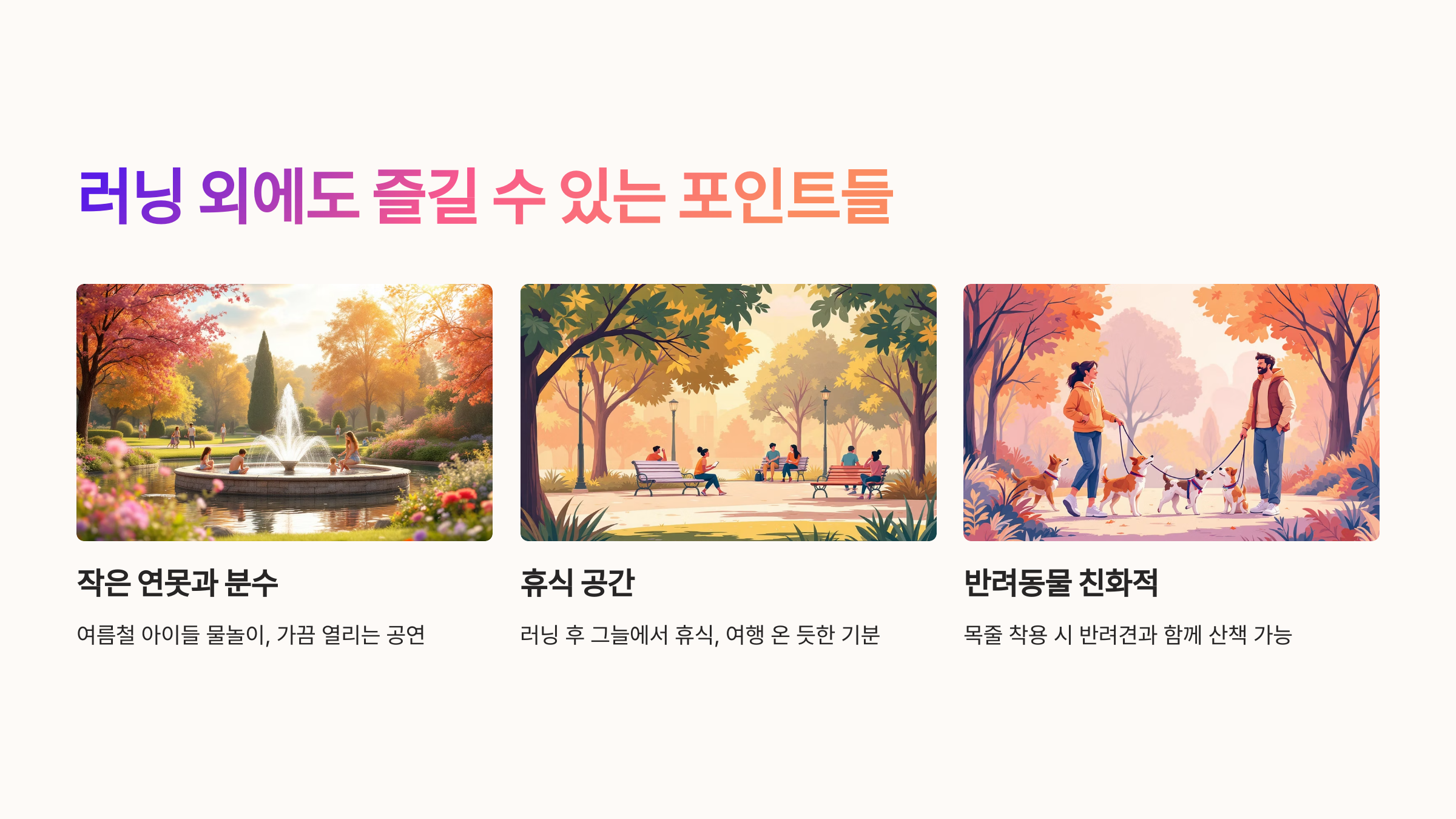 러닝뿐 아니라 힐링, 여가, 가족 시간까지 다양한 목적으로 즐길 수 있는 이 공원은 누구에게나 열려 있는 공간이었습니다.