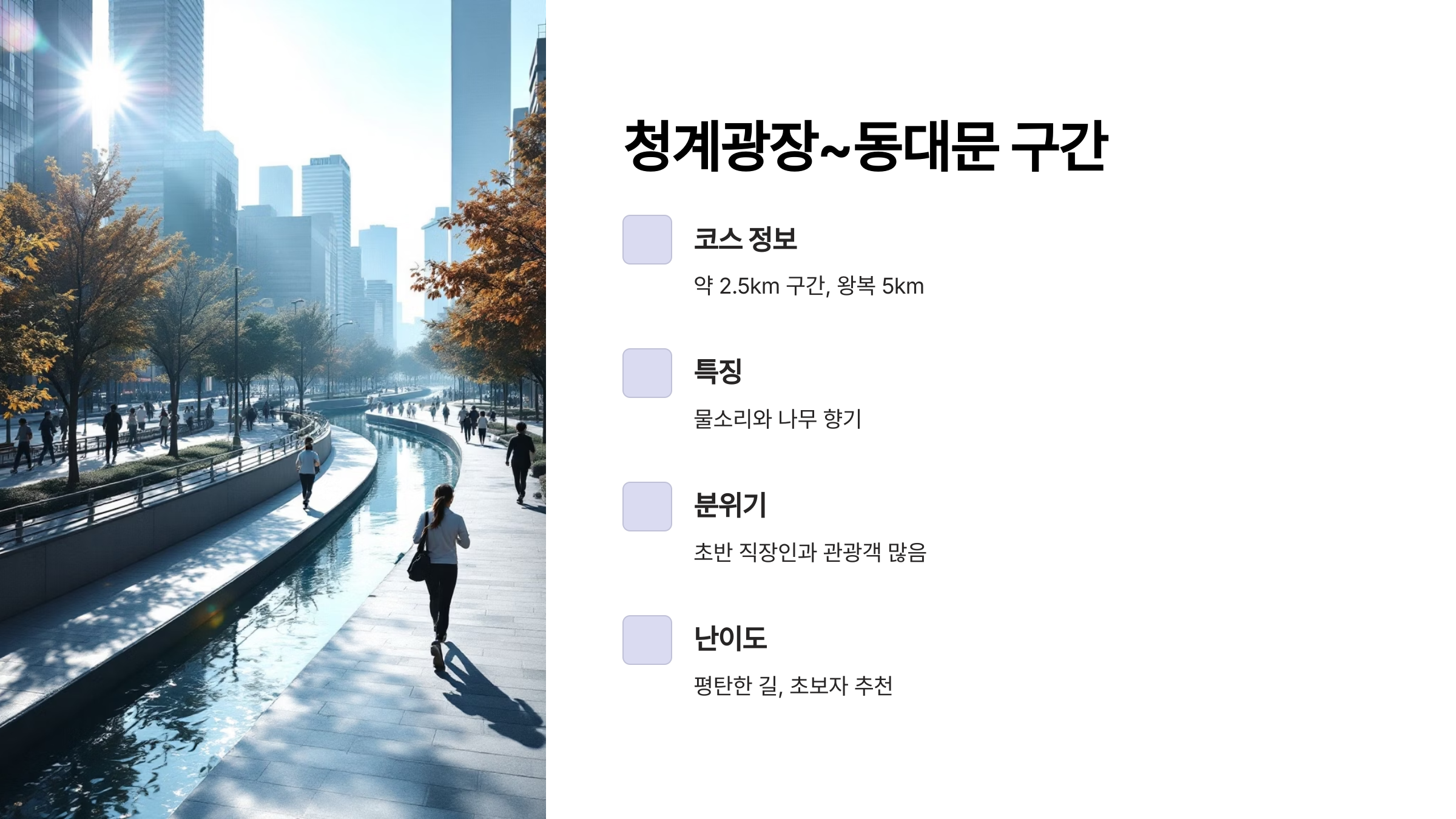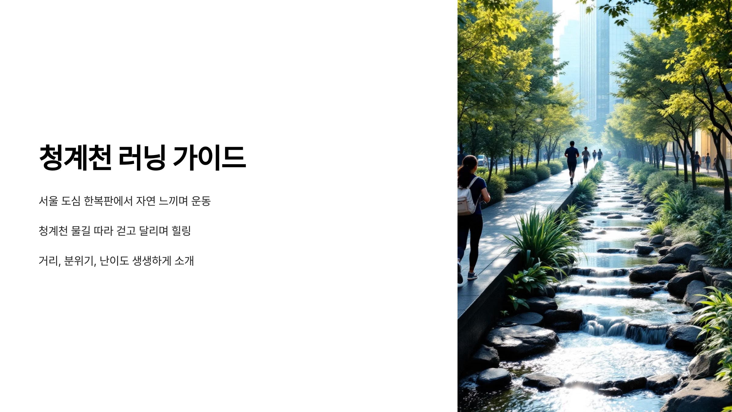 서울 도심 한복판에서 자연을 느끼며 운동할 수 있는 장소를 찾는다면, 저는 주저 없이 청계천을 추천하고 싶어요. 아침 햇살이 부드럽게 비추는 청계천 물길을 따라 조용히 걷거나 달리는 것만으로도, 복잡한 일상에서 한 발짝 물러나 힐링하는 느낌이 들거든요. 이 글에서는 제가 실제로 다녀온 청계천 러닝 코스를 중심으로 여러분께 친절하게 소개드리려 해요. 거리, 분위기, 체감 난이도까지 생생하게 전달할게요. 청계천 러닝이 처음이신 분들도, 이미 다녀오셨던 분들도 공감하며 읽으실 수 있도록 준비했답니다.
