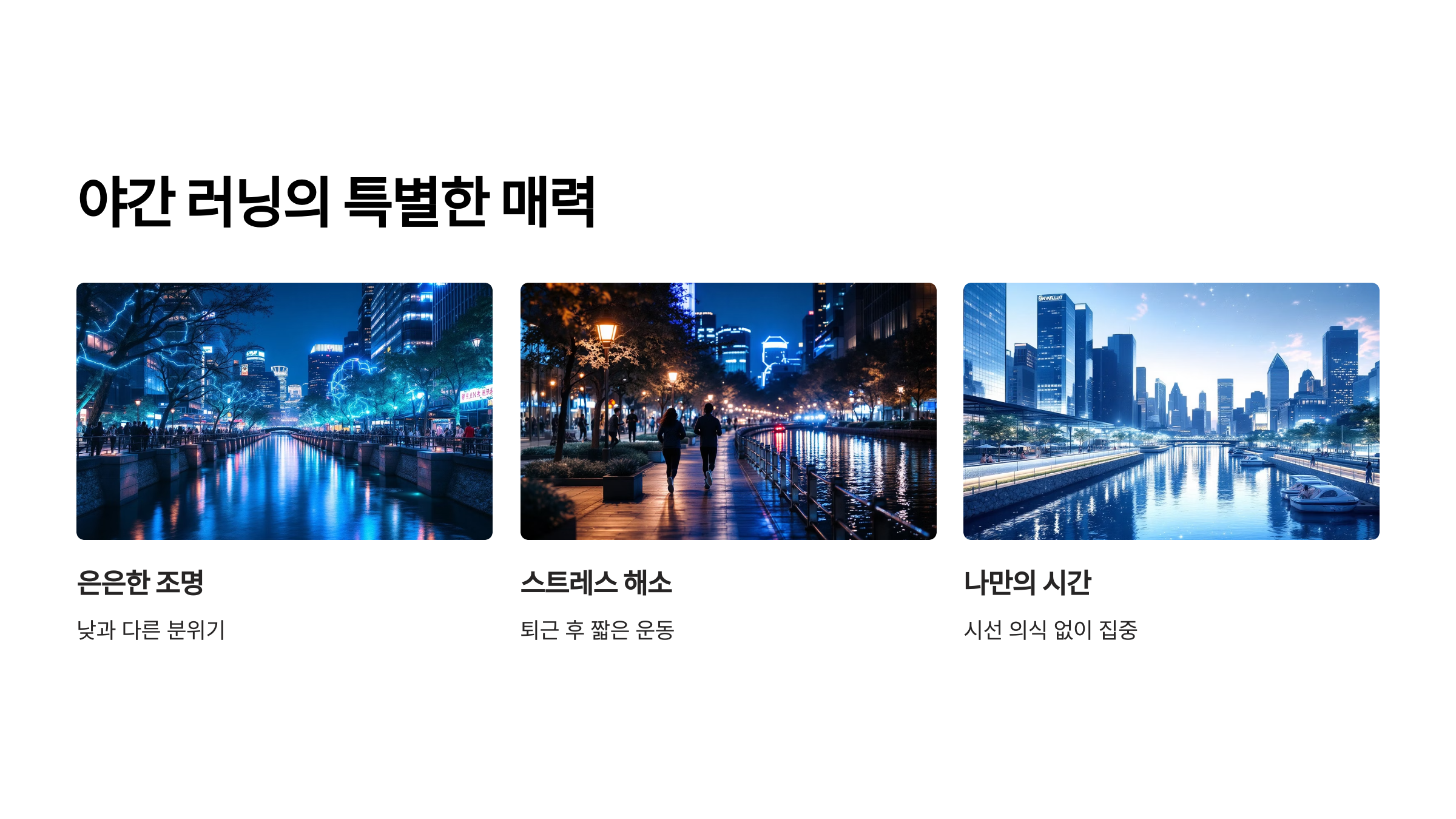 청계천 러닝이 매력적인 이유 중 하나는 바로 '야경'이에요. 저녁 시간대가 되면 청계천에는 은은한 조명이 켜지며 낮과는 전혀 다른 분위기를 만들어내죠. 특히 퇴근 후 짧은 거리라도 몸을 움직이고 싶을 때, 청계천의 야간 러닝만큼 좋은 선택은 없다고 생각해요. 물 위에 비치는 불빛과 함께 달리다 보면 하루 동안 쌓였던 스트레스가 눈 녹듯 사라지는 걸 느낄 수 있어요. 제가 가장 기억에 남는 순간은 어느 늦여름 밤, 반짝이는 물결 옆을 따라 걷다가 시원한 바람을 맞으며 뛰던 그때였어요. 이 야경 속에서는 빠르게 달릴 필요도 없고, 누군가의 시선을 의식하지 않아도 돼요. 오직 나만의 시간에 집중할 수 있답니다. 물론 야간에는 밝은 색 운동복을 입고, 이어폰을 너무 크게 틀지 않는 등 안전을 챙기는 것도 잊지 말아야 해요. 그렇게 하루를 정리하는 기분으로 마무리하는 청계천의 밤 러닝은 정말이지, 도심 속 최고의 힐링이에요.