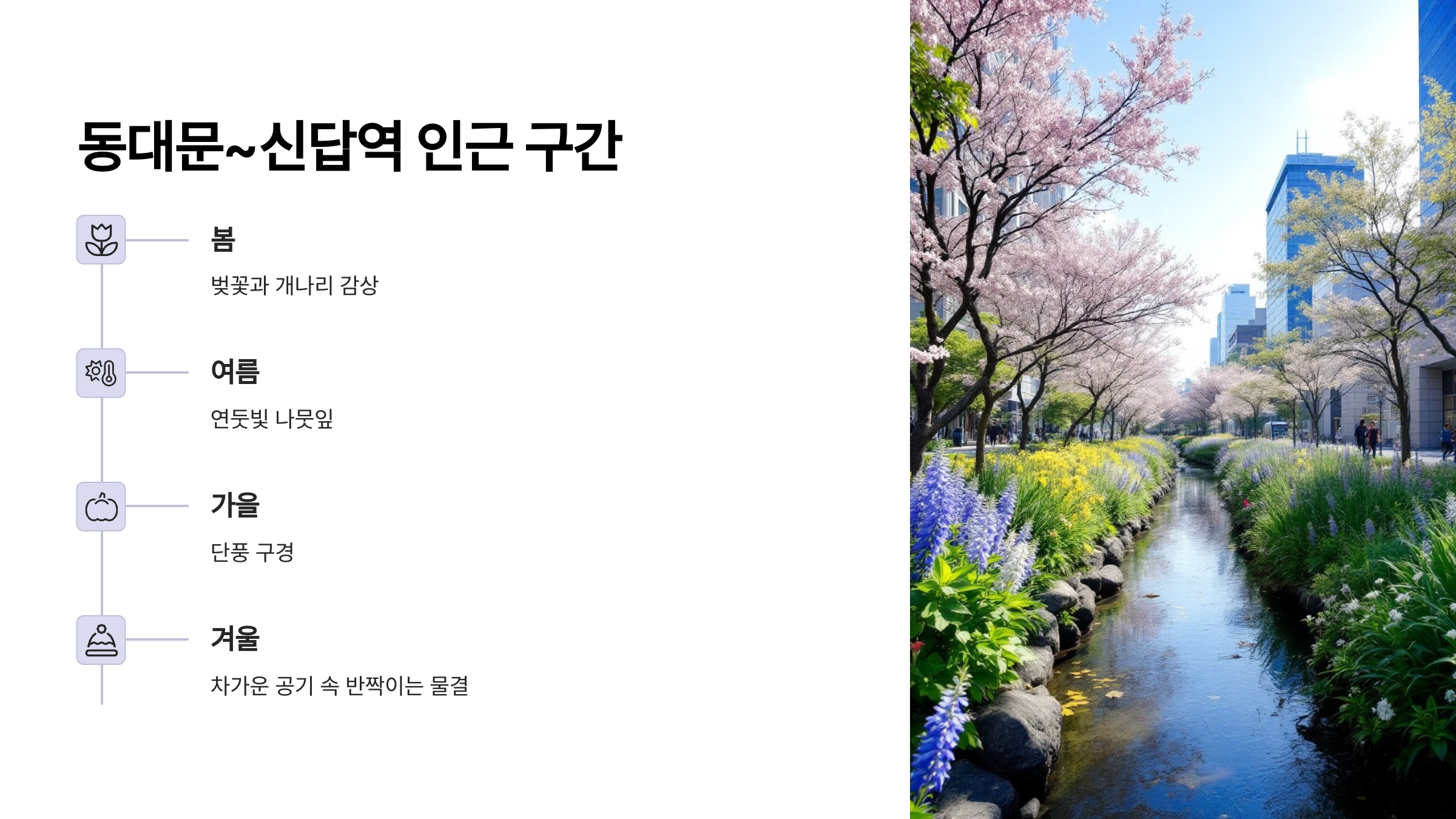 러닝에 조금 익숙해졌을 무렵, 저는 구간을 좀 더 늘려보기로 했어요. 동대문을 지나 신답역 인근까지, 약 3km 구간이 이어지는데요. 이곳은 상대적으로 인적이 드물고, 주변에 고층 건물이 적어 하늘이 더 넓게 보이는 장점이 있어요. 무엇보다 조용한 분위기 덕분에 러닝에 몰입할 수 있는 시간이 늘어나요. 제가 이 구간을 좋아하는 이유는 단순히 러닝 때문만은 아니에요. 천변에 피어 있는 계절별 야생화를 감상하며 달리는 그 시간 자체가 참 소중하거든요. 봄이면 벚꽃과 개나리, 여름엔 연둣빛 나뭇잎, 가을에는 단풍, 겨울엔 차가운 공기 속 반짝이는 물결까지, 매 계절이 다른 느낌을 주어요. 또 중간중간에 나무 벤치가 있어서 힘들 땐 잠깐 앉아 쉬어갈 수도 있고, 간단한 스트레칭을 하기에도 좋아요. 이 구간에서 달리며 저는 매번 새로운 기분을 얻는답니다.