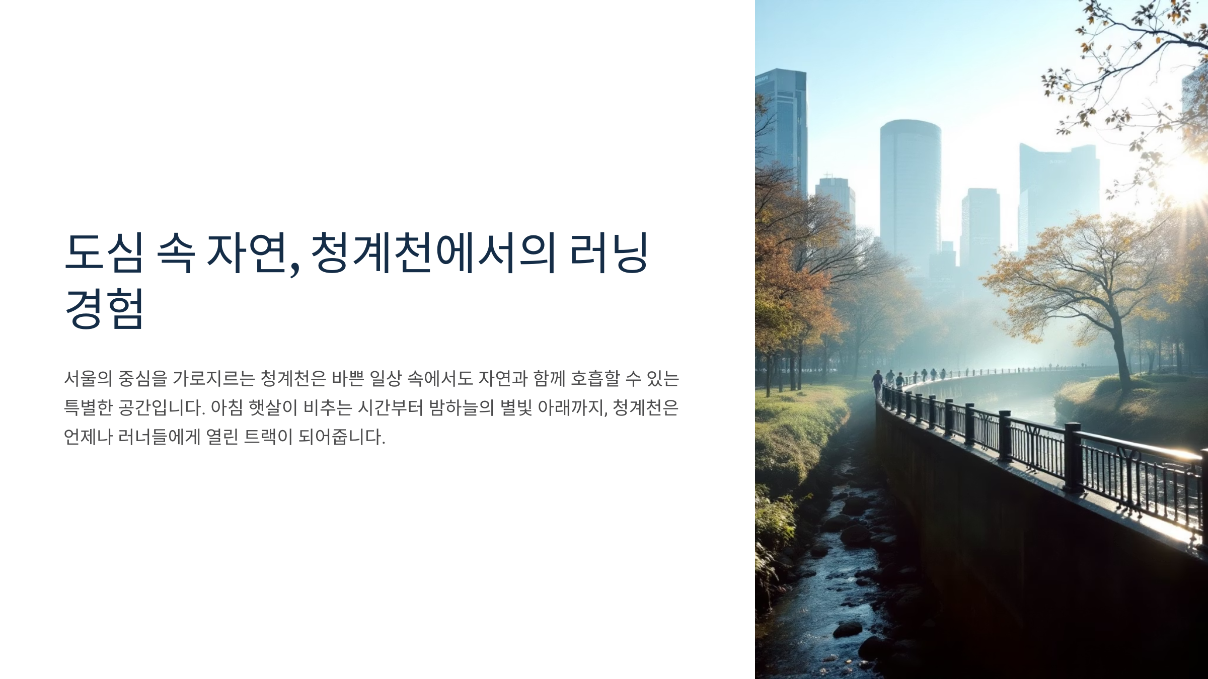 서울의 중심을 가로지르는 청계천은 바쁜 일상 속에서도 자연과 함께 호흡할 수 있는 특별한 공간입니다. 아침 햇살이 비추는 시간부터 밤하늘의 별빛 아래까지, 청계천은 언제나 러너들에게 열린 트랙이 되어줍니다. 저 역시 이곳에서 달리기를 시작하며 도심 속에서의 작은 여유를 찾았습니다.