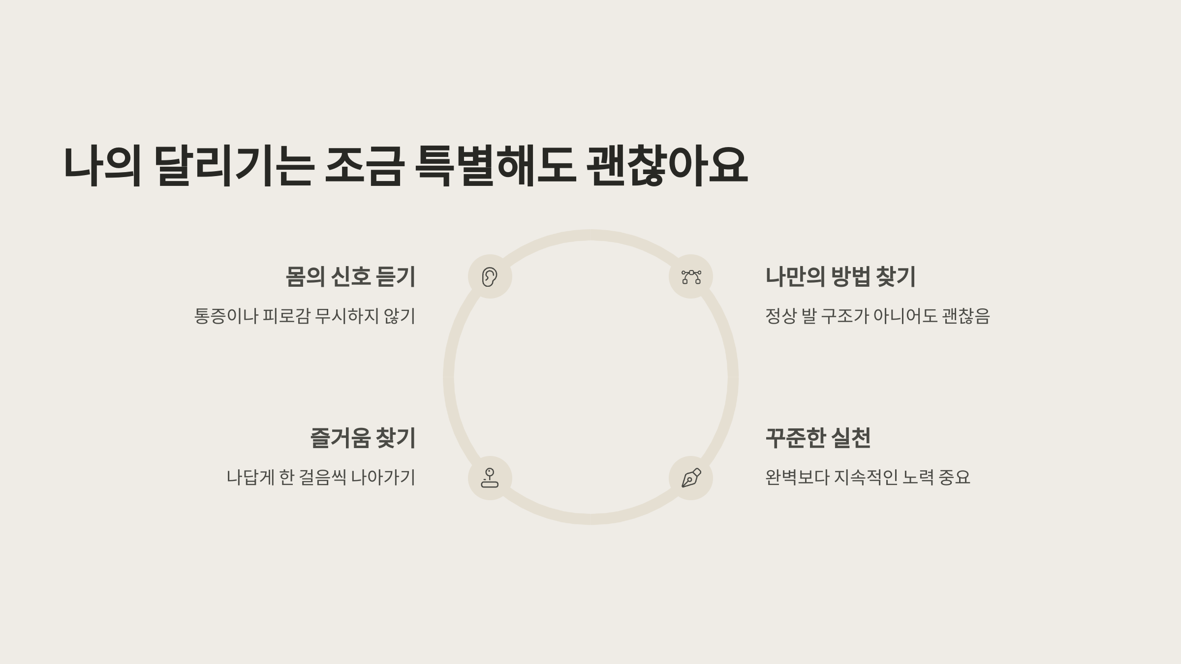 지금도 가끔은 달리고 나면 발이 무거운 날이 있어요. 그래도 예전처럼 통증에 좌절하거나 억지로 무리하지 않아요. 왜냐면 이젠 제 몸의 신호를 더 잘 듣게 되었고, 나만의 방법으로 조율할 수 있게 되었거든요.