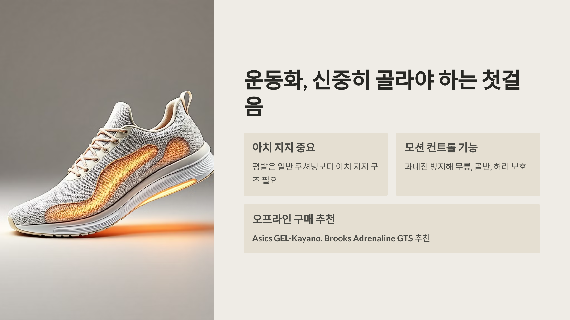 모션 컨트롤 기능이 있는 제품이 좋고, Asics, Brooks, Saucony 등의 브랜드 제품이 추천됩니다.