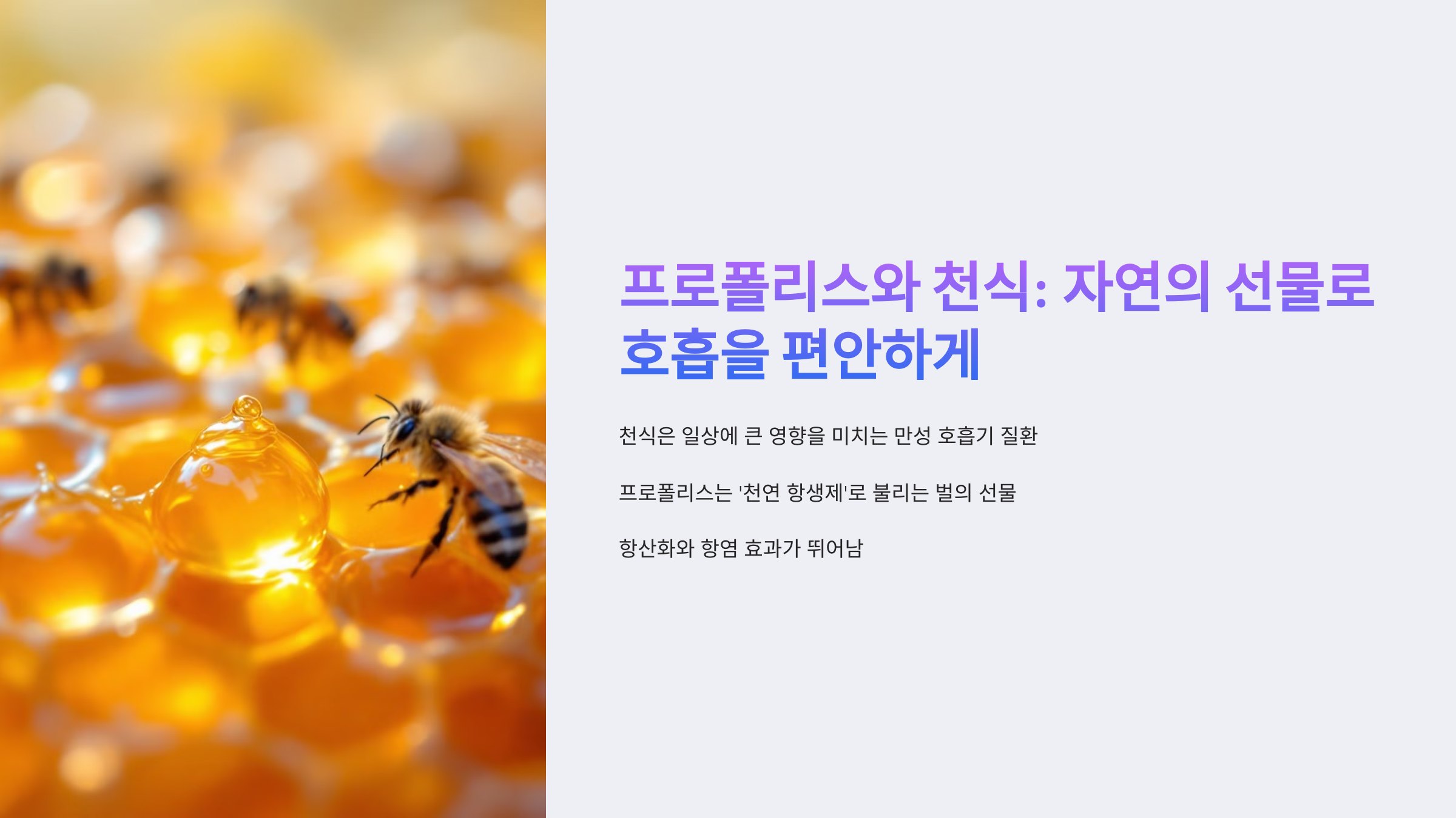 천식은 숨쉬는 것조차 버거울 만큼 일상에 큰 영향을 미치는 만성 호흡기 질환입니다. 예고 없이 찾아오는 기침, 쌕쌕거리는 숨소리, 가슴을 짓누르는 답답함은 많은 사람들에게 두려운 존재로 다가옵니다. 이런 천식을 관리하고 완화할 수 있는 방법 중 최근 주목받고 있는 자연 소재가 바로 프로폴리스입니다. ‘천연 항생제’라 불리는 이 물질은 벌들이 벌집을 보호하기 위해 만든 자연 방어체계의 결정체로, 항산화와 항염 효과가 뛰어난 것으로 알려져 있습니다. 그렇다면 과연 프로폴리스가 천식에 어떤 방식으로 도움이 될 수 있을까요? 이 글에서는 그 가능성을 과학적 근거와 함께 하나하나 살펴보려 합니다. 당신이나 가족, 지인이 천식으로 고생하고 있다면 반드시 한 번쯤은 읽어봐야 할 이야기입니다.