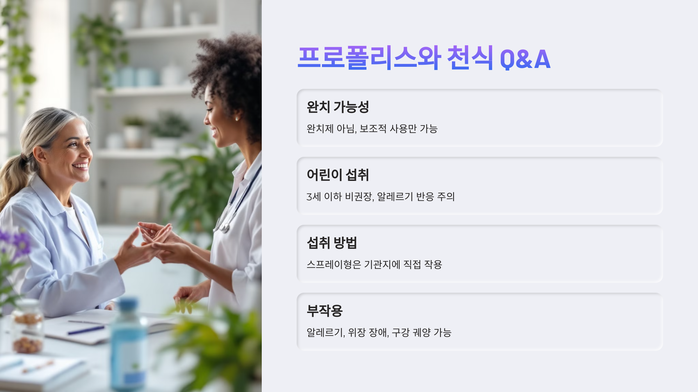 A3. 상황에 따라 다르지만, 스프레이형은 목과 기관지에 직접 작용해 천식 환자에게 유리할 수 있습니다. 정제나 액상형은 꾸준한 면역 보완용으로 좋습니다.