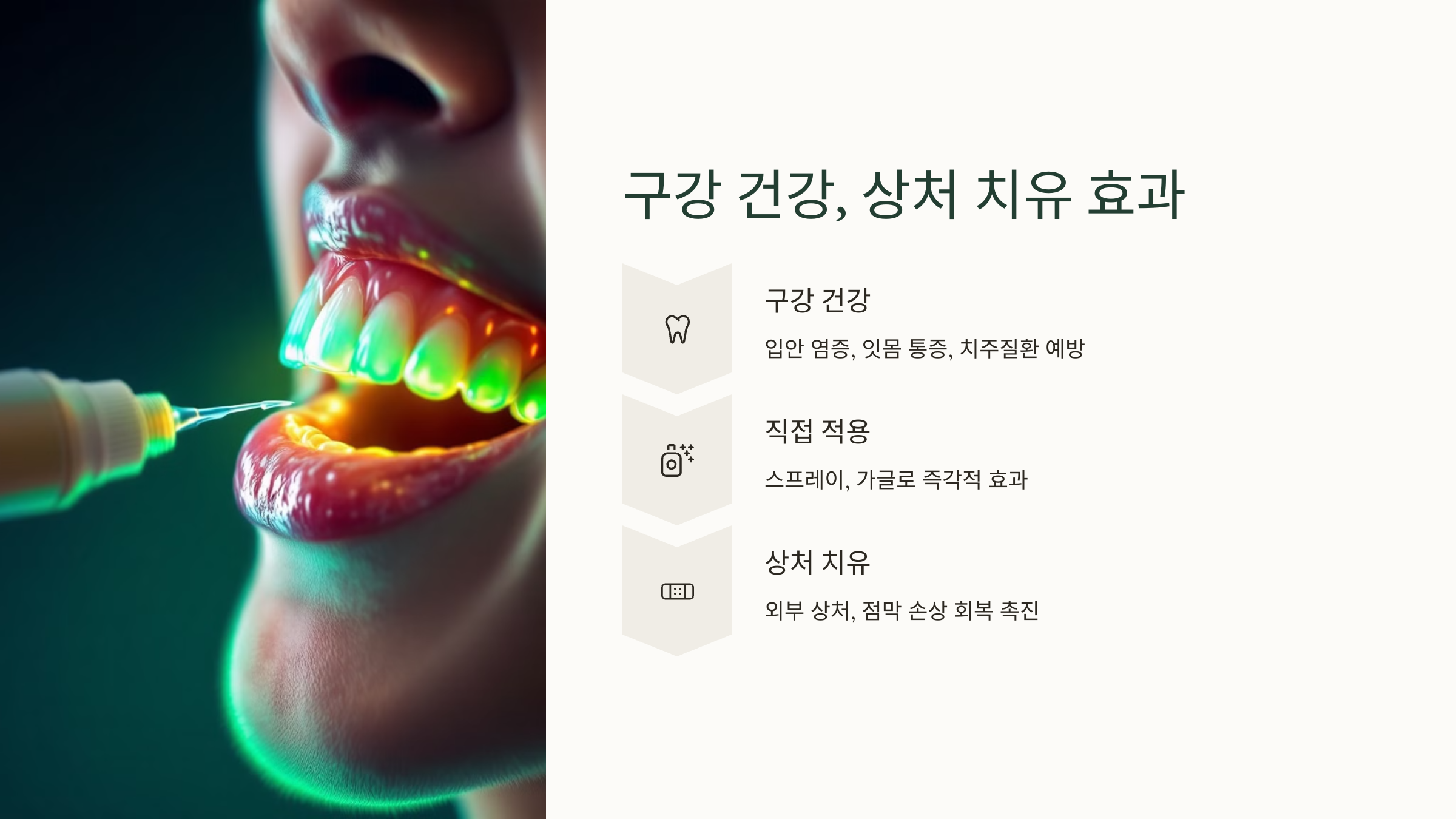 프로폴리스는 강력한 항균 및 항염 특성을 가지고 있어 입 안의 세균 번식을 억제하고, 염증을 진정시켜주는 역할을 합니다. 특히 스프레이 형태나 가글 제품으로 활용할 경우, 직접적인 부위에 빠르게 작용하여 즉각적인 효과를 느낄 수 있습니다. 아침에 일어났을 때 입 안이 텁텁하거나, 피곤할 때 자주 입병이 생기는 분들에게는 정말 추천하고 싶은 자연 요법입니다.