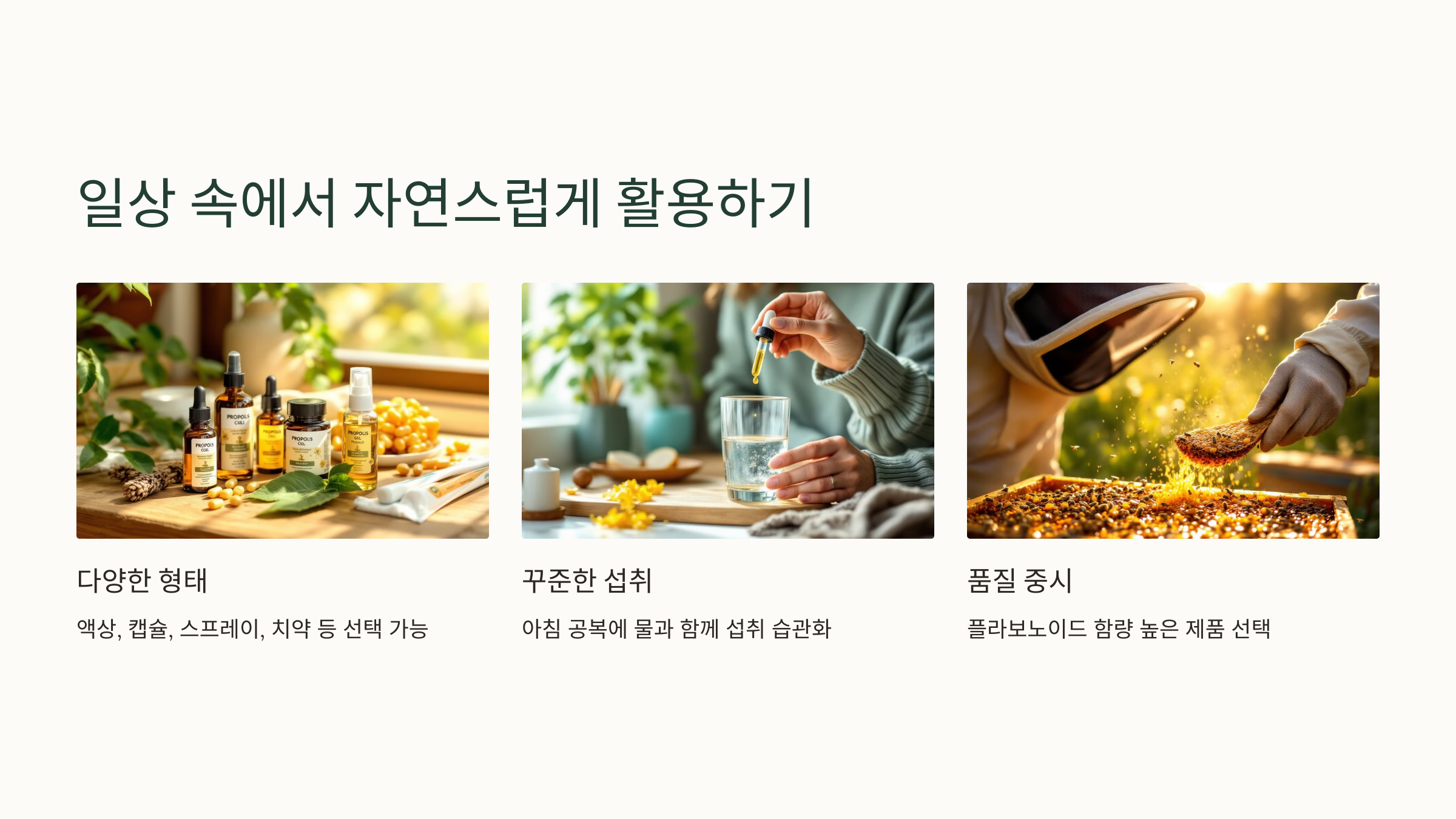 건강에 좋은 것, 알면 뭐하냐는 말 들어보셨나요? 중요한 건 실천입니다. 아무리 좋은 효능도 꾸준히 챙기지 않으면 의미가 없죠. 프로폴리스 역시 마찬가지입니다. 오늘 소개한 면역력, 항산화, 구강 건강 외에도 항암 효과, 위장 보호, 피부 개선 등 다양한 이점이 있지만, 이것들이 진짜 우리 몸에 작용하려면 어떻게 일상에서 활용하느냐가 핵심이죠.