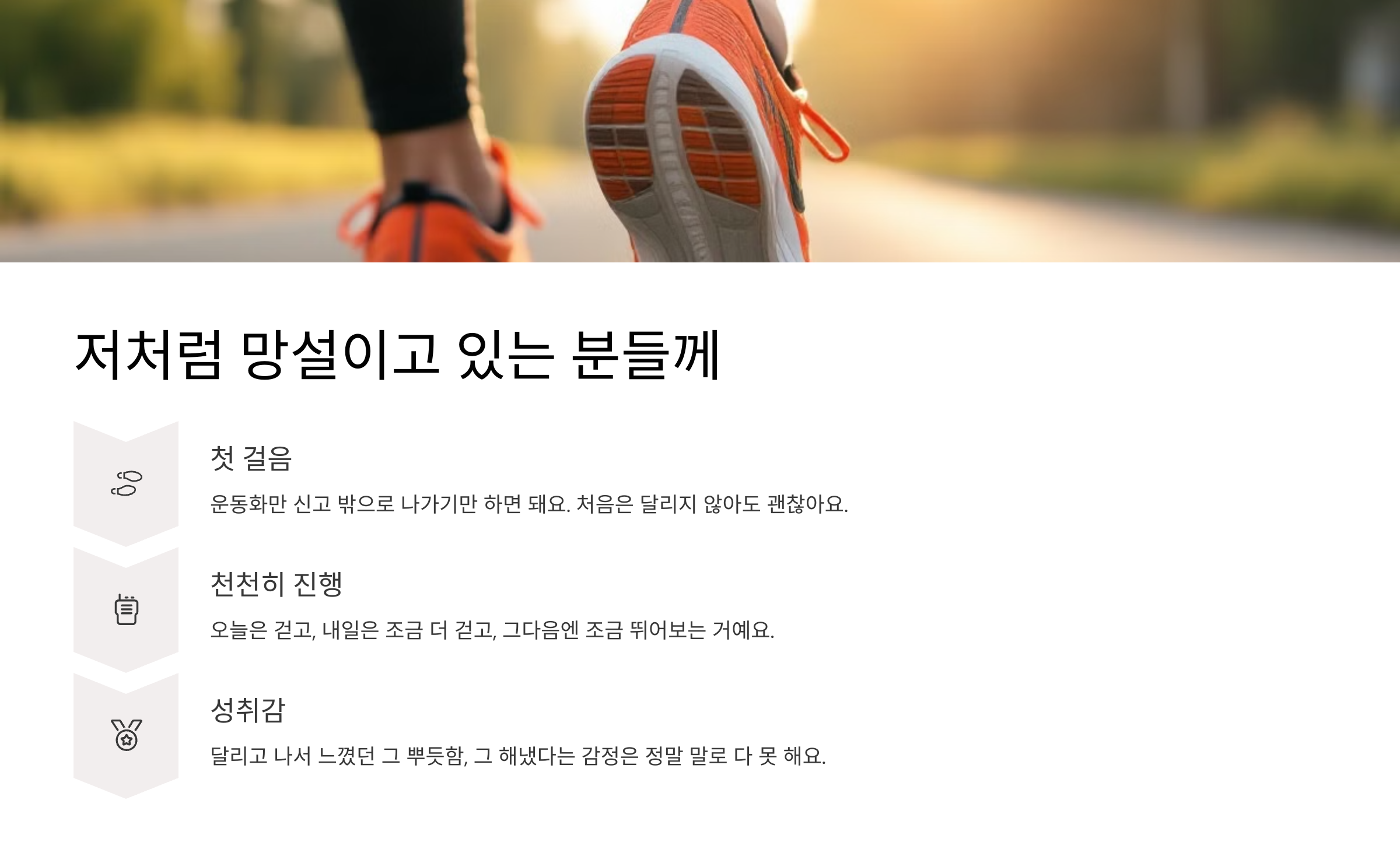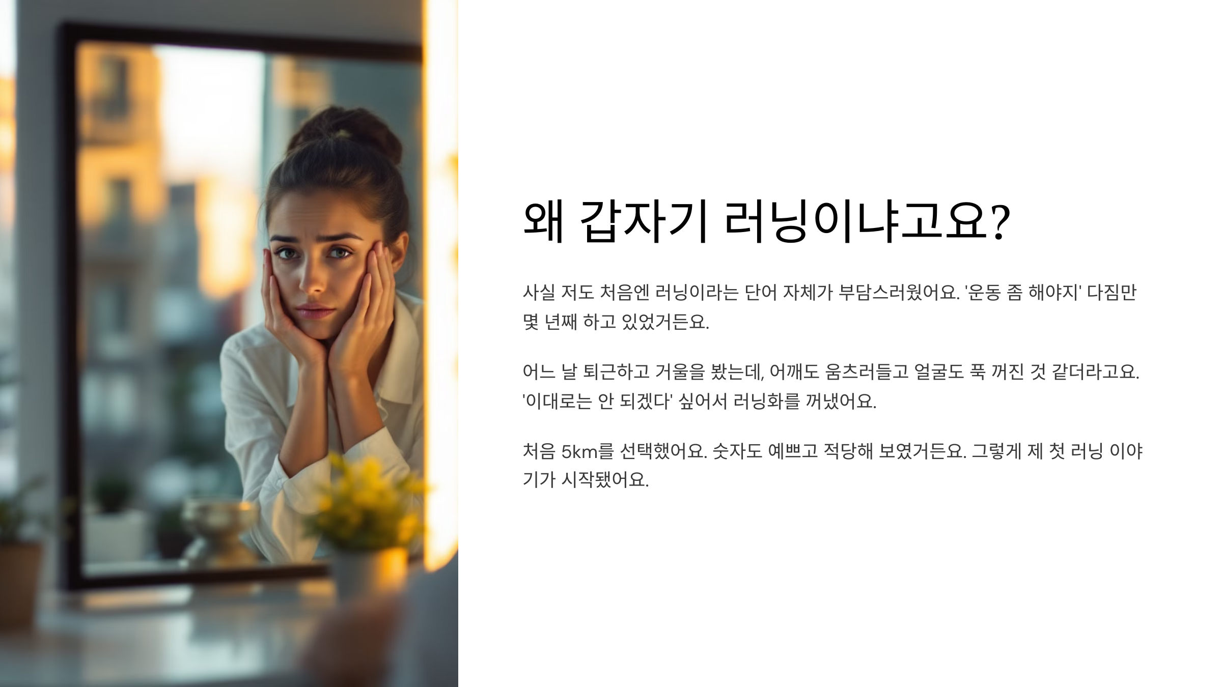 러닝은 절대 거창한 게 아니었어요. 러닝화 한 켤레와 ‘해볼까?’ 하는 마음만 있으면 충분했어요. 잘 뛰지 않아도 괜찮아요. 걷다가 쉬어도 괜찮아요. 그냥 나를 위해 한 걸음 내딛는 그 순간이 중요한 거니까요.