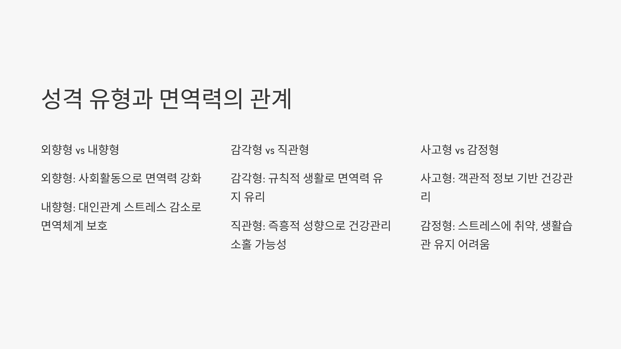MBTI와 면역력의 관계는 아직까지 명확하게 과학적으로 증명되지는 않았지만, 성격이 스트레스, 생활 습관, 건강 관리 방식 등에 영향을 미친다는 점을 고려하면 간접적인 연관성은 충분히 존재할 가능성이 크다. 따라서 MBTI 유형을 이해하고 자신의 성향에 맞는 건강 관리 방법을 찾는 것이 중요하다.