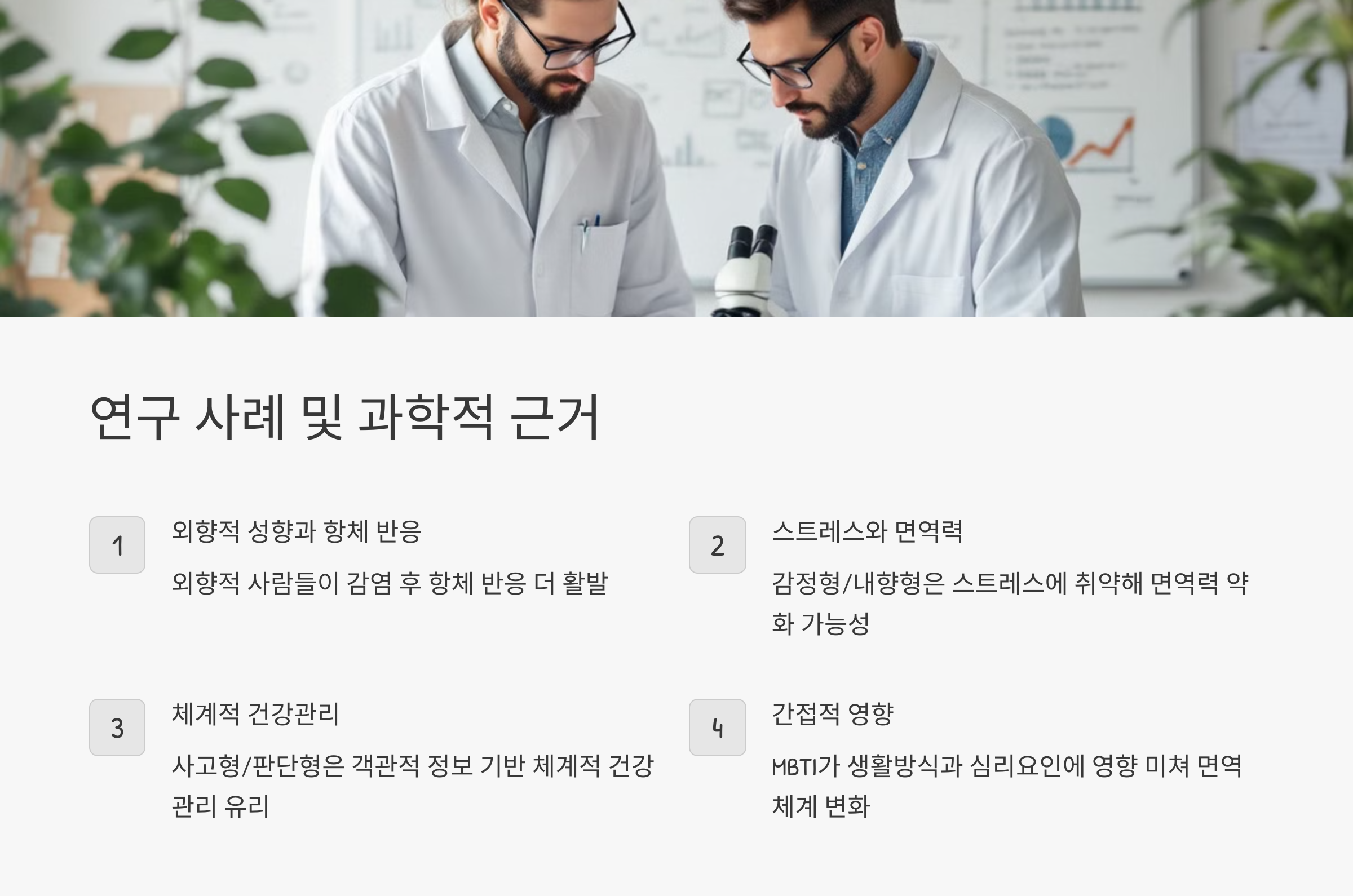 MBTI 성격 유형과 면역력 간의 관계를 뒷받침하는 과학적 연구는 제한적이지만, 성격과 면역력 사이의 관련성을 탐구한 연구들은 존재한다. 예를 들어, 외향적인 사람들이 감염 후 항체 반응이 더 활발하다는 연구 결과가 있으며, 이는 그들이 더 많은 사회적 활동을 하면서 다양한 병원체에 노출된 결과일 수도 있다. 또한, 스트레스가 면역력에 미치는 영향을 고려했을 때, 감정형이나 내향적인 사람들은 스트레스를 더 쉽게 받는 경향이 있어 면역력이 상대적으로 약화될 가능성이 있다. 반대로, 사고형이나 판단형은 객관적인 정보에 기반하여 건강 관리를 보다 체계적으로 할 가능성이 높아 면역력을 일정 수준 이상으로 유지하는 데 유리할 수 있다. 이러한 연구 결과들은 MBTI 유형이 직접적으로 면역력을 결정하는 것이 아니라, 성격이 생활 방식과 심리적 요인에 영향을 미치면서 간접적으로 면역체계에 변화를 줄 수 있음을 시사한다.