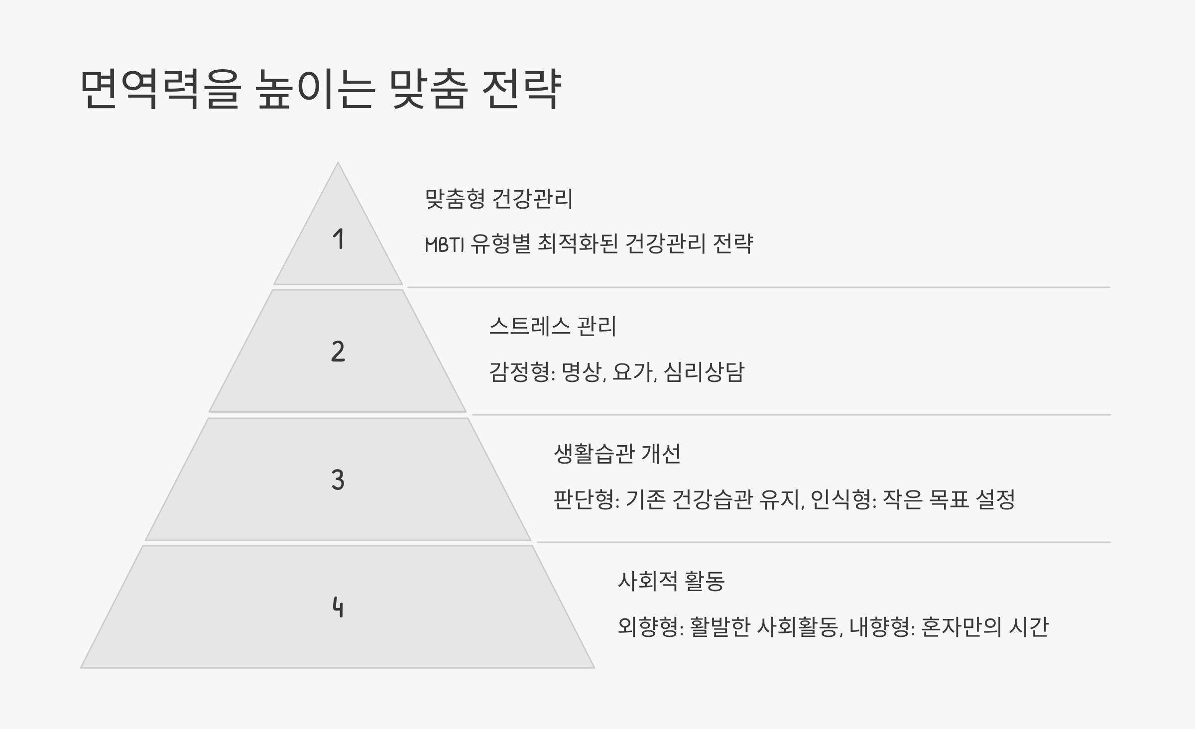 면역력을 강화하기 위해서는 MBTI 유형에 따라 자신에게 맞는 건강 관리 전략을 수립하는 것이 중요하다. 예를 들어, 스트레스에 민감한 감정형이라면 명상, 요가, 심리 상담 등의 방법을 통해 스트레스를 효과적으로 관리하는 것이 필요하다. 반면, 사고형은 논리적으로 건강 정보를 분석하고 실천하는 습관을 길러야 하며, 외향형은 활발한 사회적 활동을 통해 면역력을 높이는 전략을 취하는 것이 유리할 수 있다. 또한, 판단형은 기존의 건강 습관을 유지하는 데 강점을 가지므로 이를 적극 활용해야 하며, 인식형은 즉흥적인 성향을 보완하기 위해 작은 목표를 세우고 꾸준히 실천하는 것이 도움이 될 수 있다. 이처럼 MBTI 유형에 따라 맞춤형 건강 관리 전략을 세운다면, 성격과 면역력의 관계를 긍정적으로 활용할 수 있을 것이다.